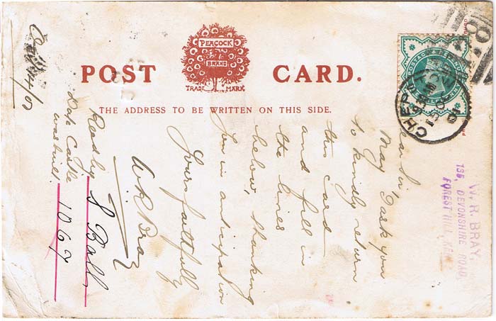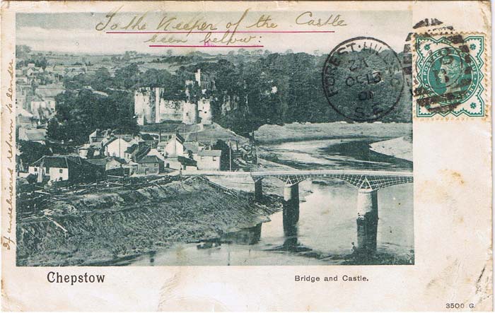 Picture postcard sent by Bray to The Keeper of the Castle, seen below (picture of Chepstow Bridge and Castle) on 13th October 1901