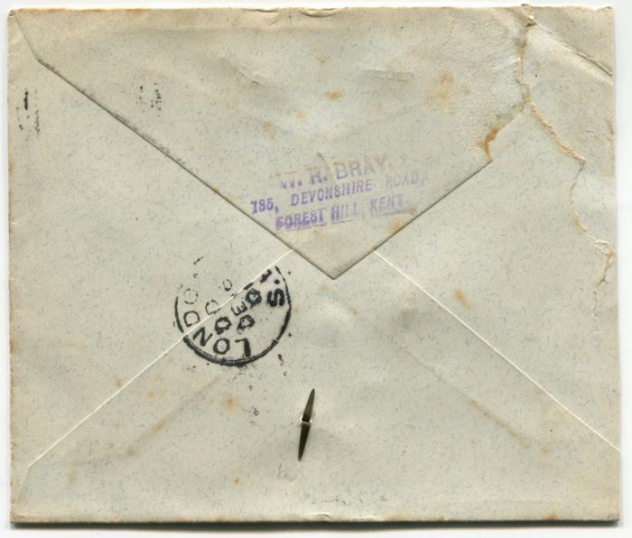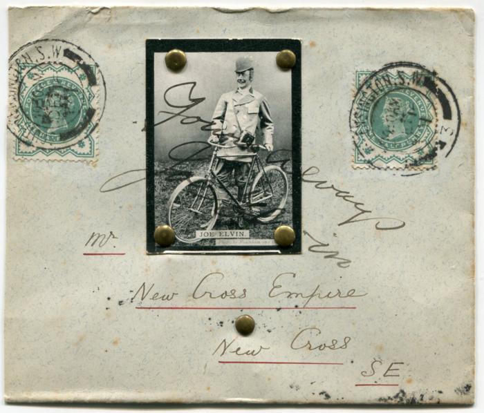 Envelope sent by Bray to (Cigarette card featuring Joe Elvin) on 16th December 1901 requesting his autograph.