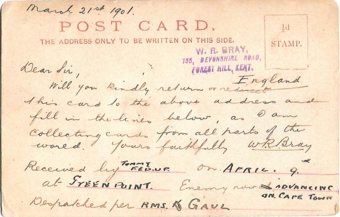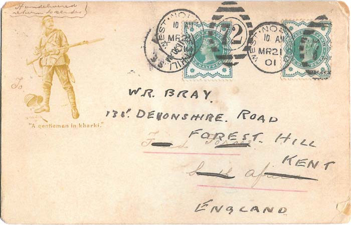 Picture postcard featuring a "Gentleman in Kharki" sent by Bray to Field Forces, South Africa on 21st March 1901 with a request for information.