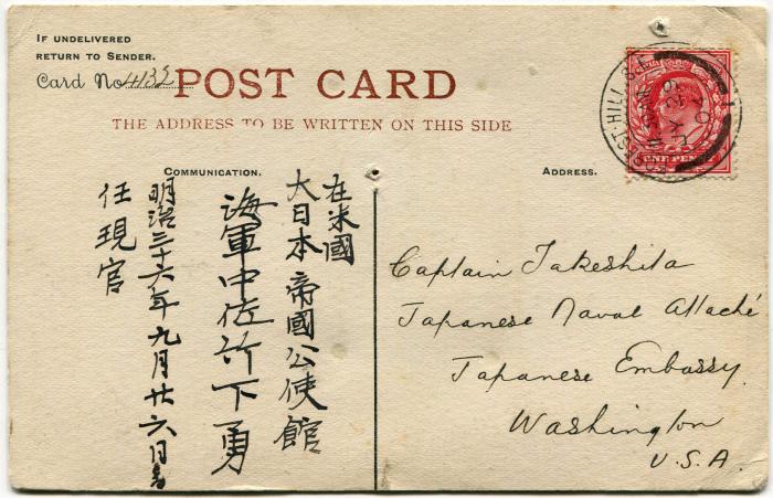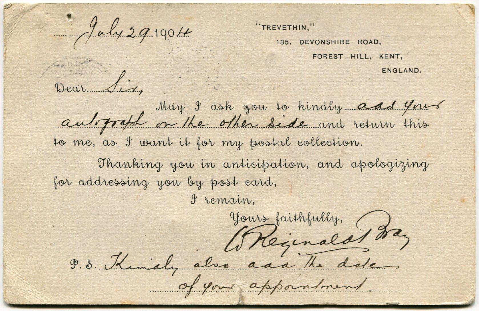 Postcard sent by Bray to Captain Takeshita on 29th July 1904 asking for his autograph.