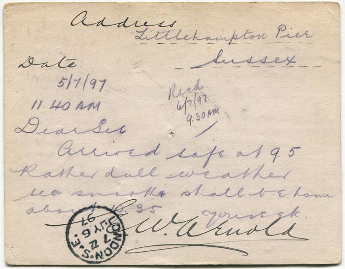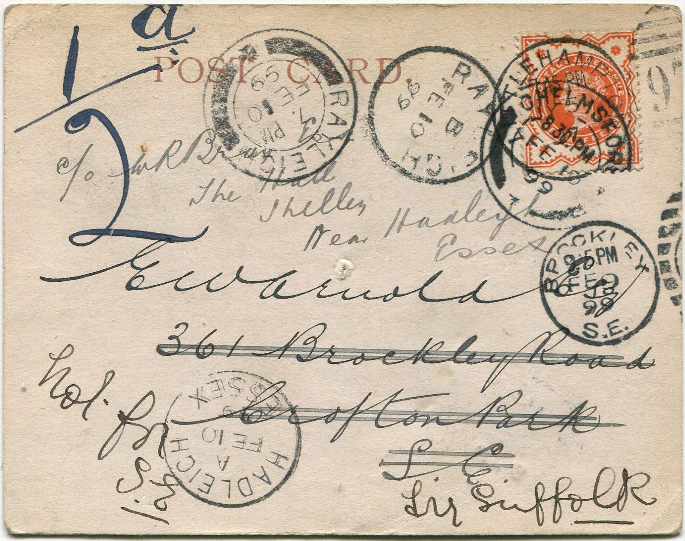 Postcard originally sent by Ernest Arnold to himself from Hastings on 28th June 1897. In 1899 Bray changed the address to a fictitious one (Shelley is in Suffolk, not Essex) and reposted to himself.