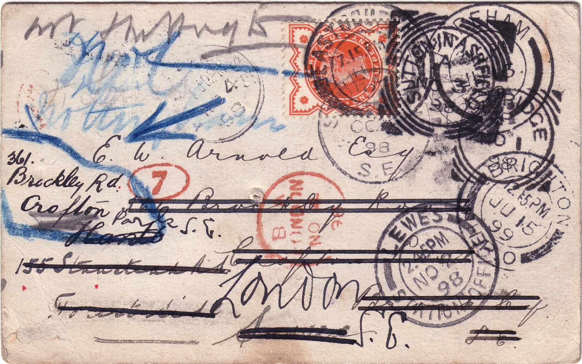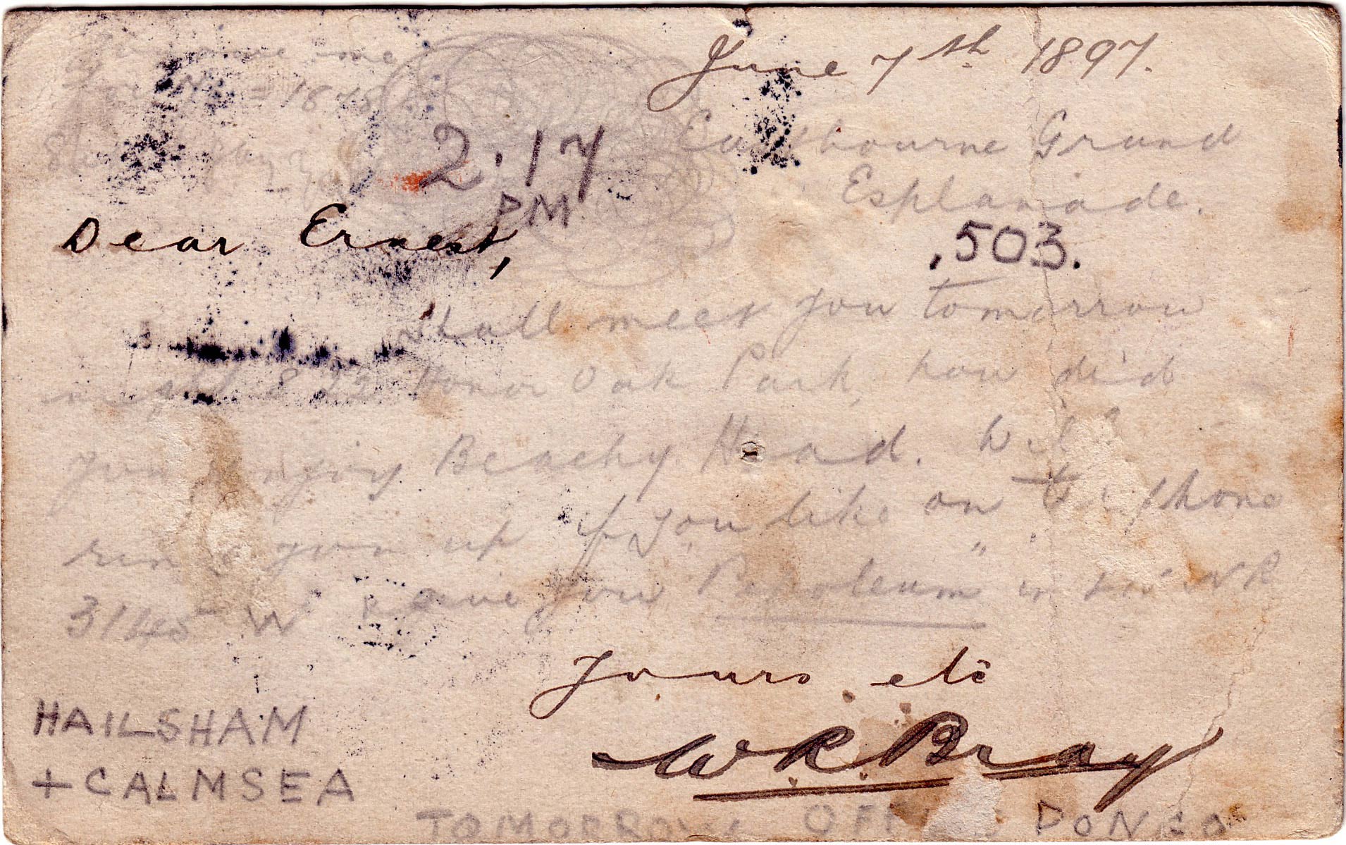 Postcard originally sent by Bray to Ernest Arnold from Eastbourne on 7th June 1897. Bray reposted the card a number of times between 1898 and 1899, at one stage changing the address to a slight variation of his own, using Sussex rather than Kent.