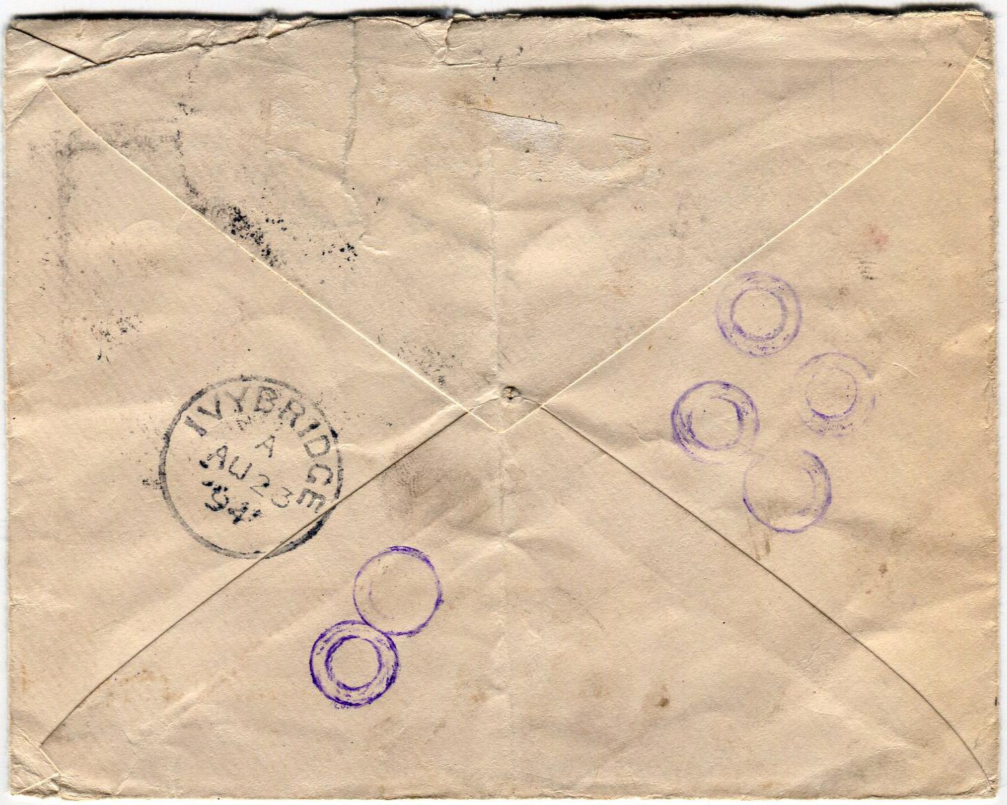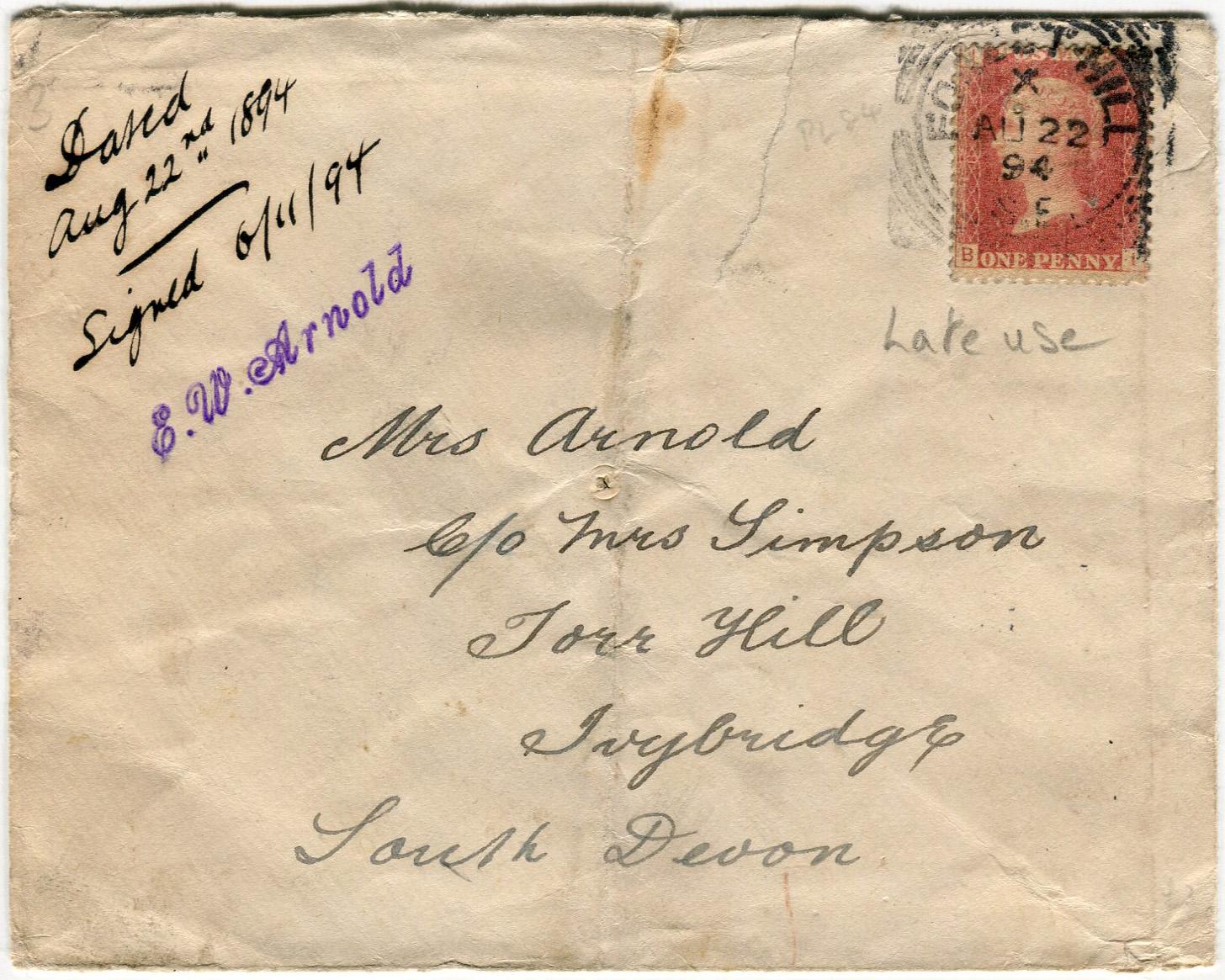 Envelope sent by Ernest Arnold to his mother wihilst she was visiting Ivybridge, sent on 22nd August 1894