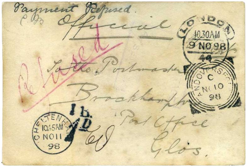 Bray neglected to affix a postage stamp and would also appear to have hand-written Official, probably to ensure that the Postmaster responded. All that happened was that the Postmaster refused to pay the 1d. charge to take delivery so the card was simply sent back to Bray with no response, albeit he had to pay the charge.