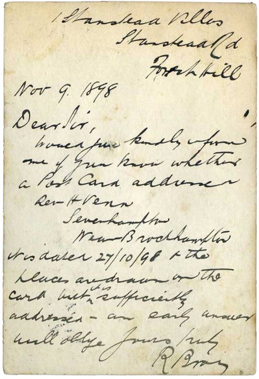 Sent by Bray to The Postmaster, Brockhampton Post Office, Glos, enquiring whether a previously sent "pictorially addressed" postcard had been delivered to The Rev H Venn, Sevenhampton, near Brockhampton.