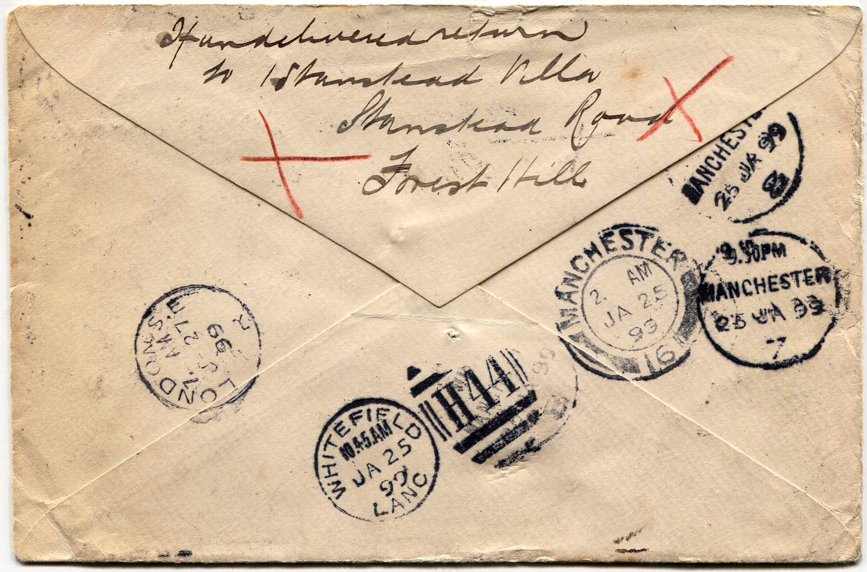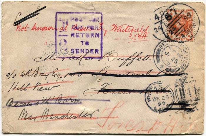 Bray “commandeered” this envelope that had been sent to his uncle and aunt, the Duffett’s who lived with his family, on 24th January 1899 and redirected to himself at a fictitious address near Manchester. The envelope was sent back as directed, with the addition of a halfpenny charge mark.