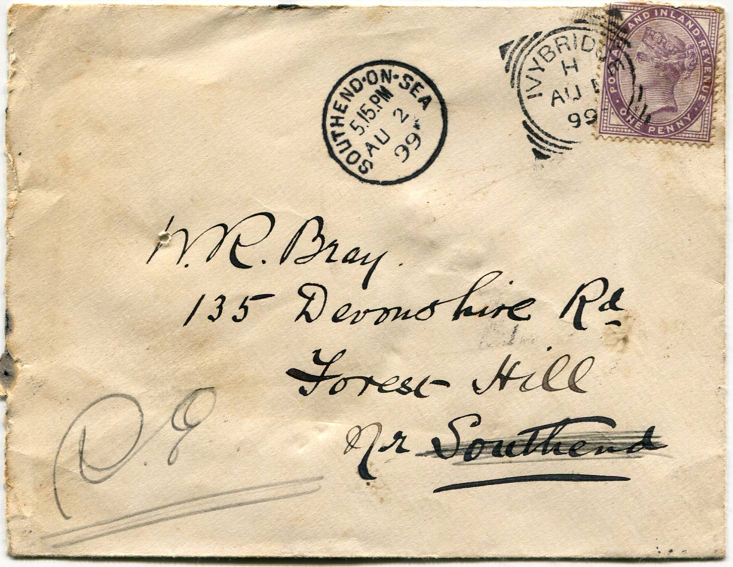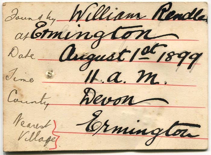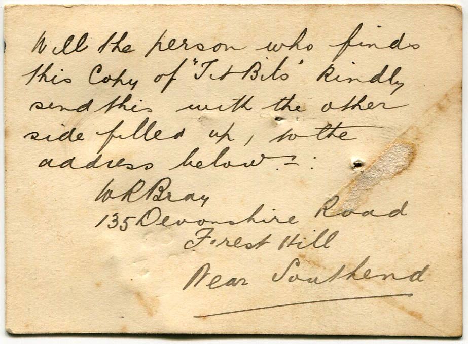 Bray attached this small card to a copy of Tit-Bits and left it in a railway carriage in July 1899.