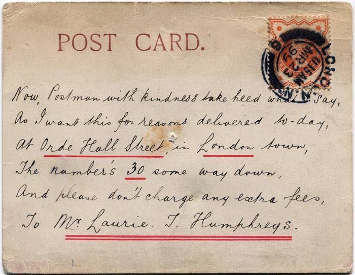 By underlining the key elements in the rhyme, Bray ensured that the card could not be rejected as incorrectly addressed.