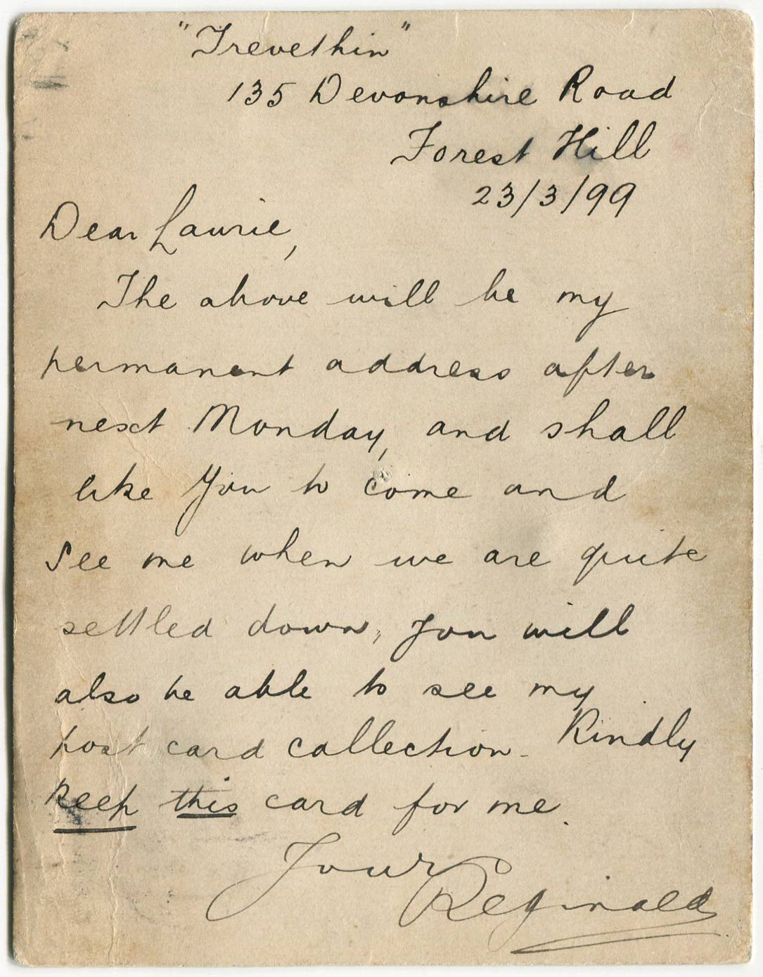 Postcard sent by Bray to the Laurie Humphreys on 23rd March 1899 with the address embedded into the words of a rhyme.