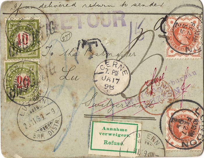 Bray used an old postmark of Cerne to form the word Lucerne in writing the address. He was successful, the card reached Switzerland and was returned complete with a Luzern postmark and two Swiss postage due stamps.