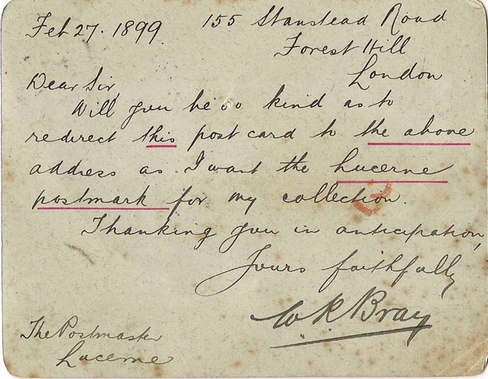 Postcard sent by Bray to The Postmaster, Lucerne, Switzerland on 27th February 1899.