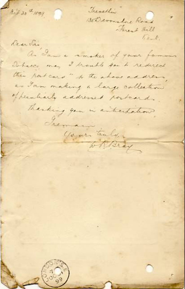 It would seem that Player's typed Bray's address and added a halfpenny postage stamp to pay for the return.