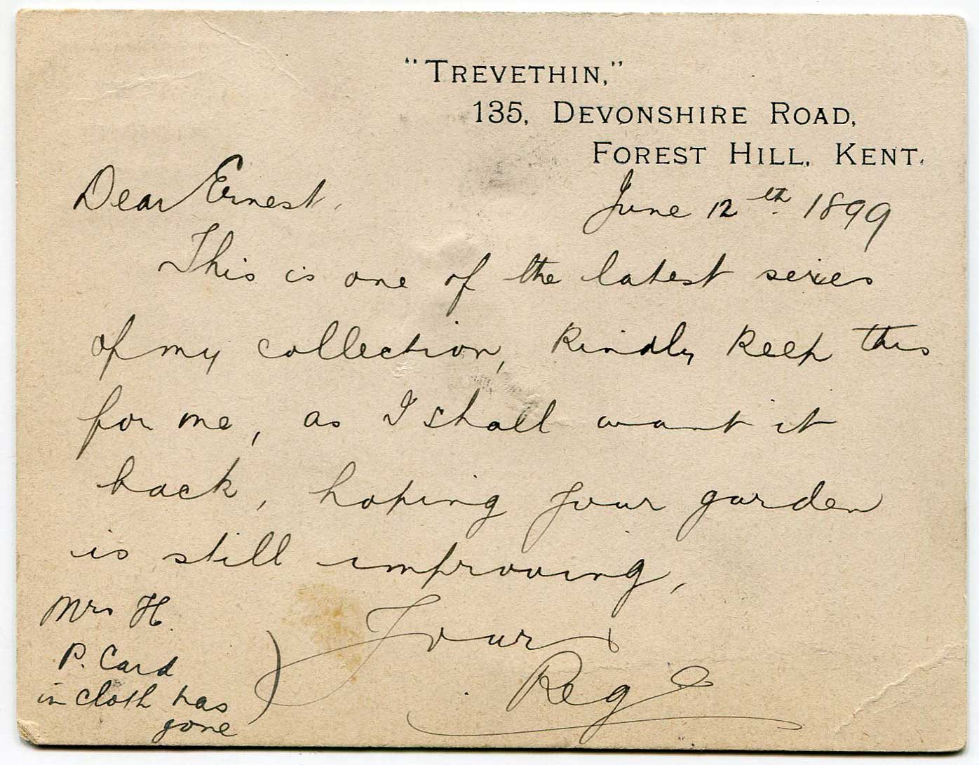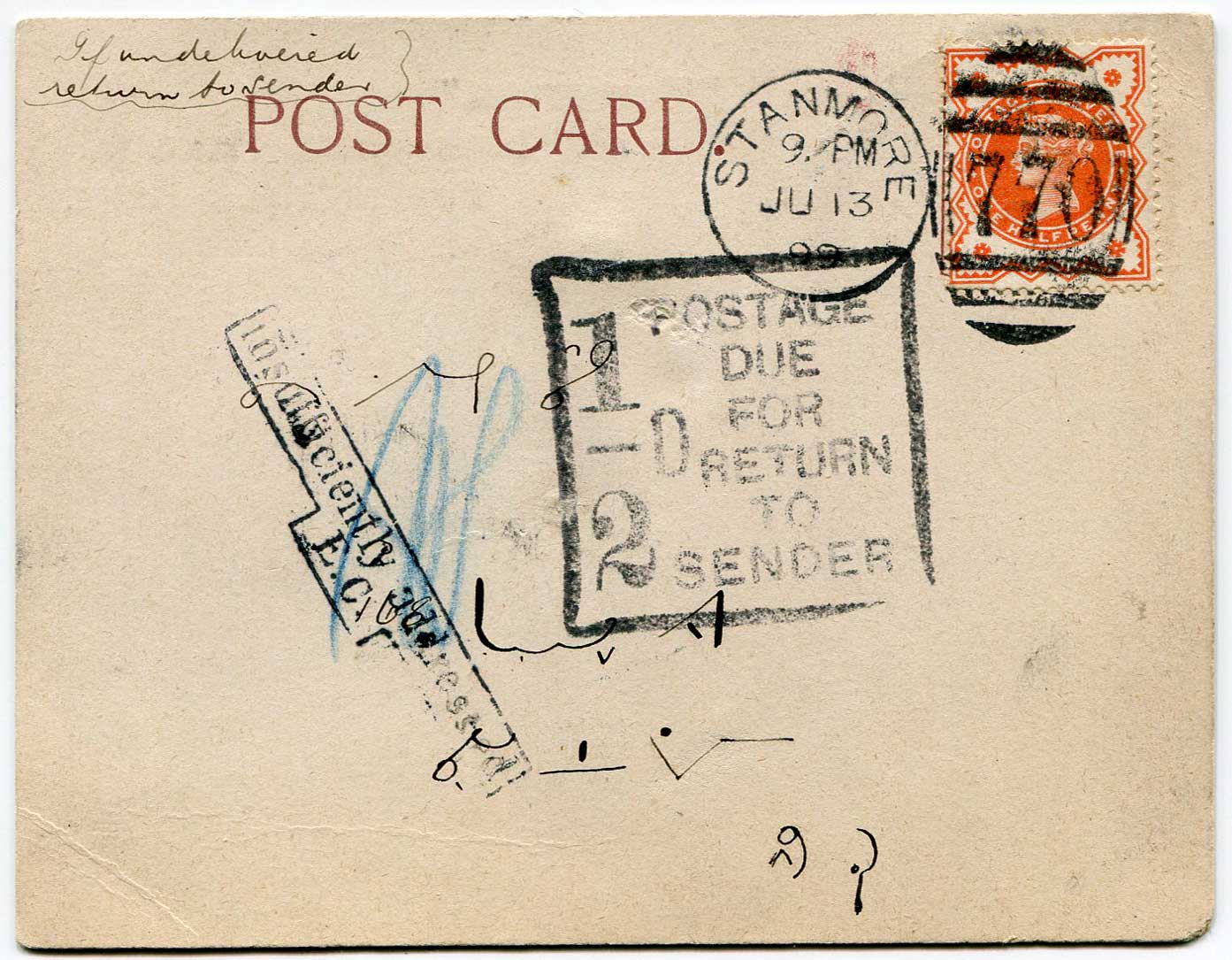 Bray sent this card to Ernest Arnold with the address written in shorthand which displeased the postal authorities resulting in halfpenny charge and the card returned undelivered.