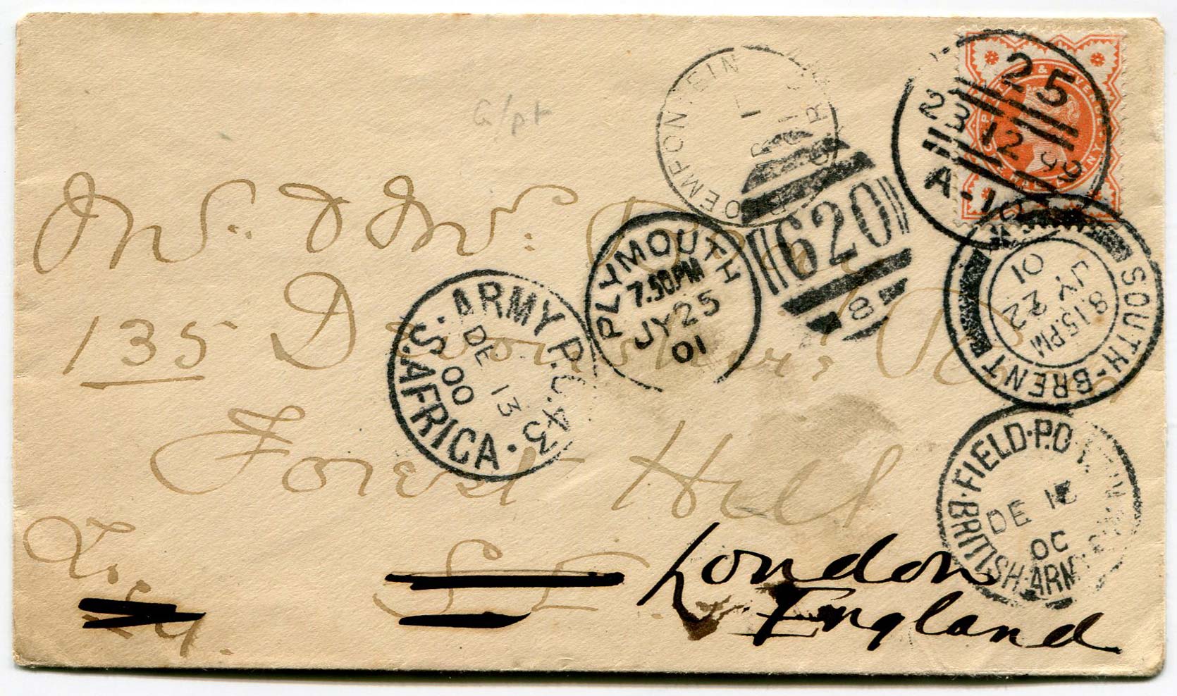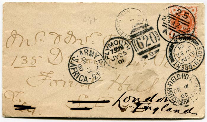 This one is a bit devious. Originally sent to Bray's parents before being "co-opted" and, probably, hidden inside a newspaper that was posted to South Africa in December 1900. Alternatively it might have been sent via the SS Africa - see previous item. Put back into the post again in July 1901