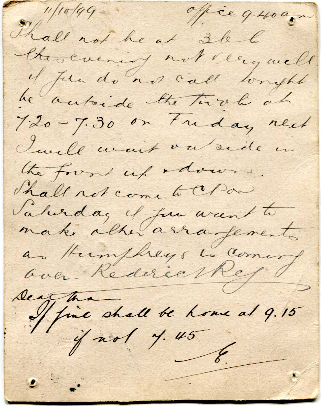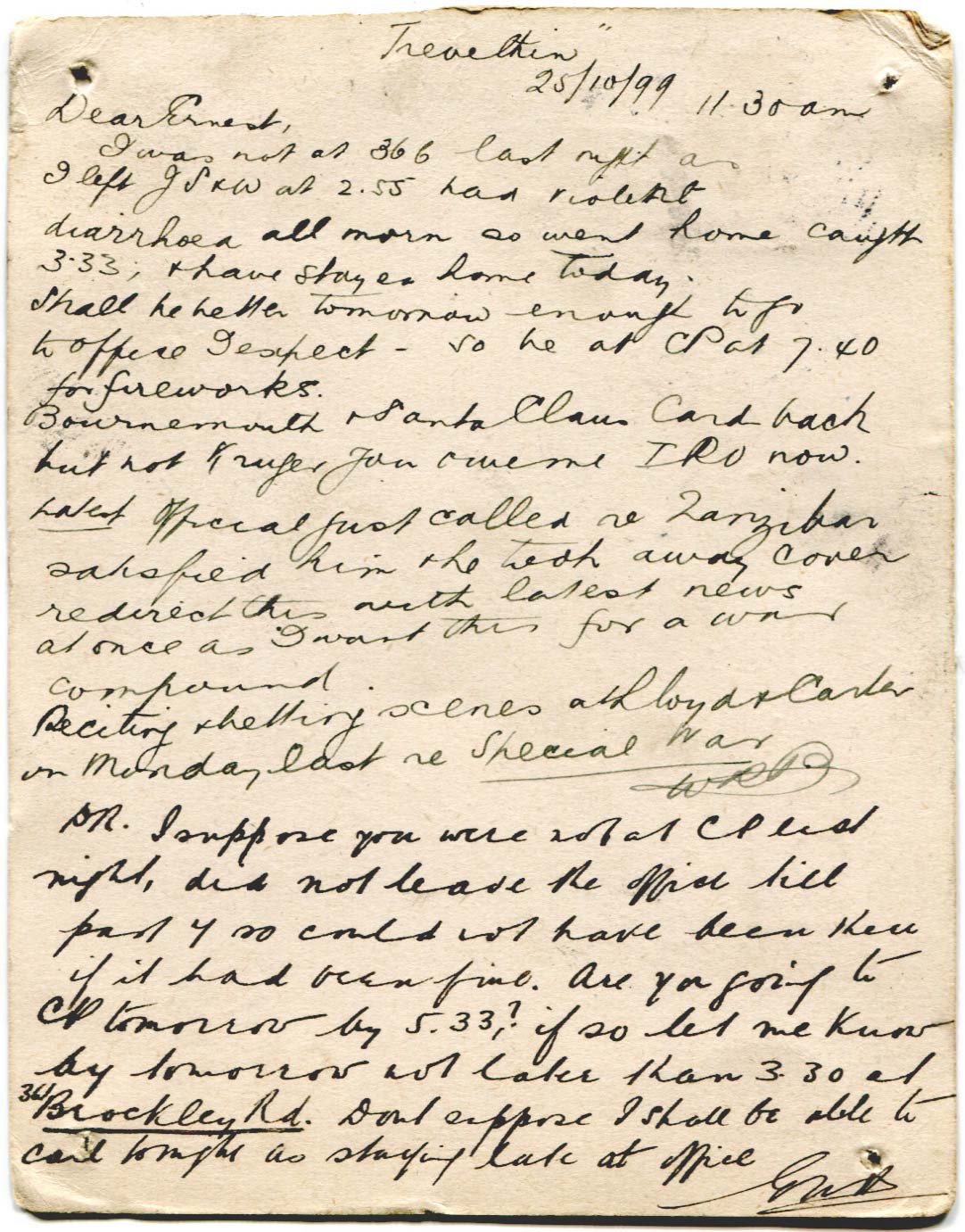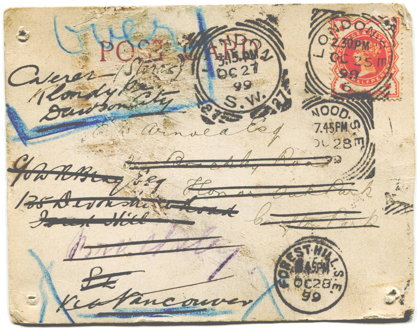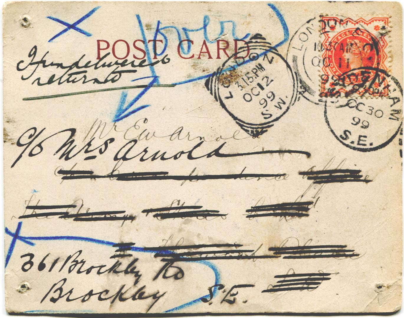 Postcard originally sent by Bray to Ernest Arnold on 25th October 1899. It was subsequently joined, back to back by the means of paper fasteners in each cornerwith another postcard and constantly redirected.