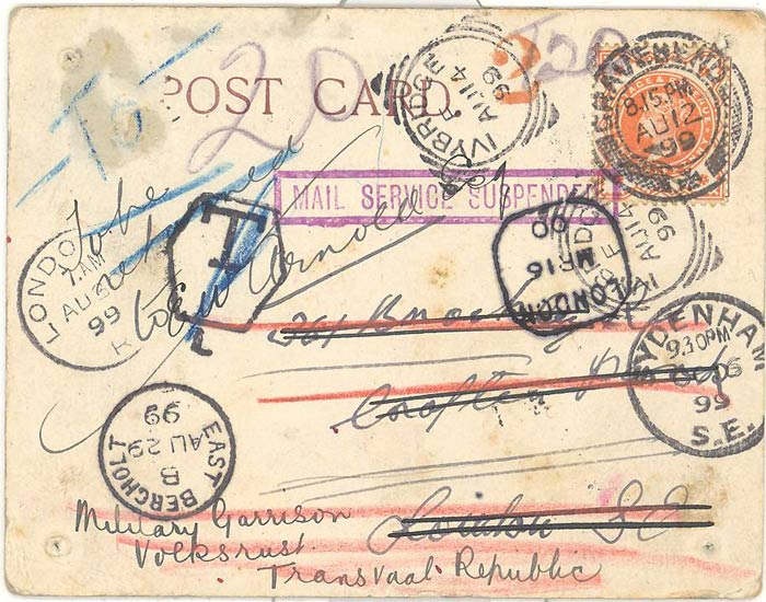 Subsequently this was joined with another card to form a “double”, as evidenced by the small holes in each corner made by paper fasteners, and reposted a number of times including an attempt to reach Volksrust, South Africa. This was rejected by the Post Office due to the outbreak of the Second Boer War as indicated by the "Mail Service Suspended" instructional mark.