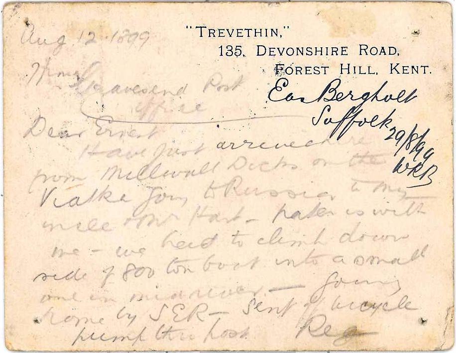 One half of a “double” card originally sent by Bray to Ernest Arnold on 12th August 1899.