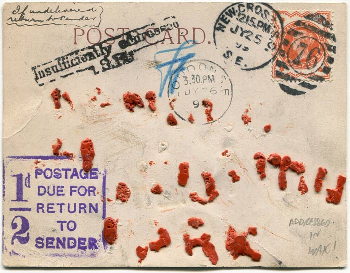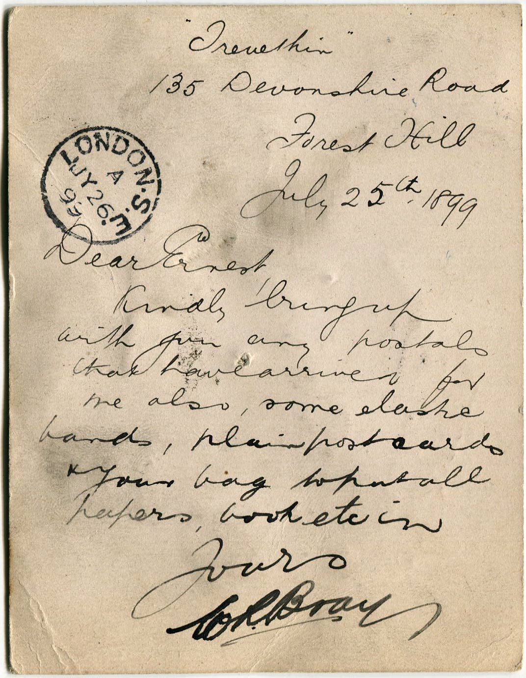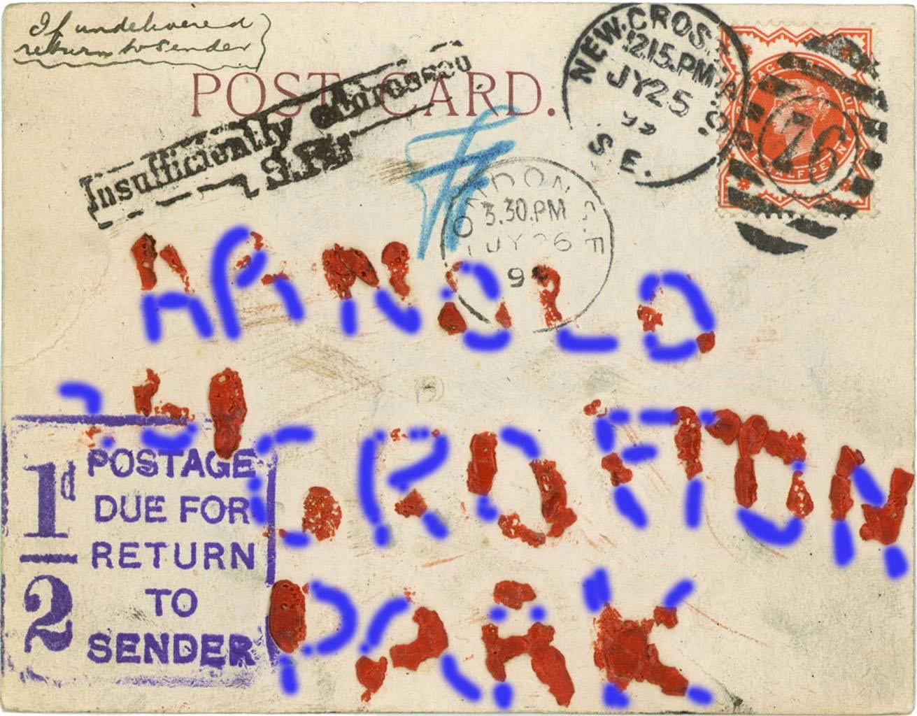 Bray wrote the address with sealing wax which, unfortunately, fell off the card whilst in the pillar box. Fortunately the message on the reverse side identifies the intended recipient to be Ernest Arnold which makes it possible to ascertain the original address as being: