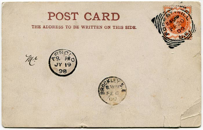 Postcard addressed by means of using old postmarks to represent "Arnold" and "Brockley".