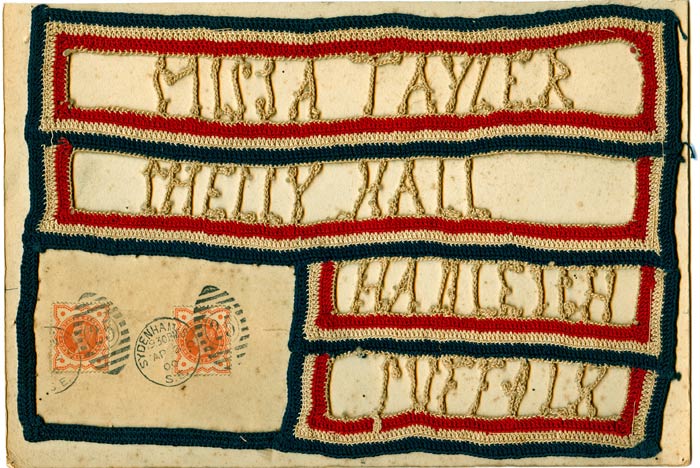 Bray persuaded his mother to crochet this magnificent item that survived the postal system. It is now mounted on a piece of thick card but when it was posted it was floppy apart from the small piece of card to which the stamps were affixed. Bray often stayed at the Hall where he befriended Agnes, daughter of the widowed owner Annie Tayler.