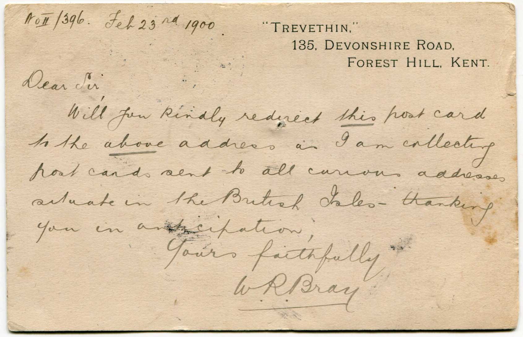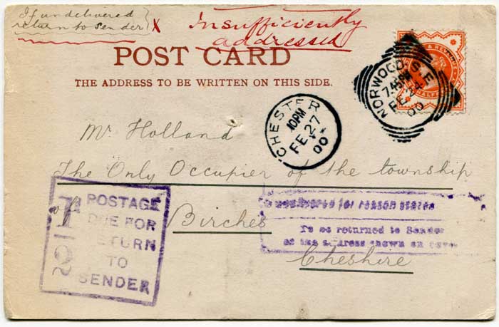 Sent by Bray to Mr Holland, The Only Occupier of the township, Birches, Cheshire on 23rd Febrary 1900.