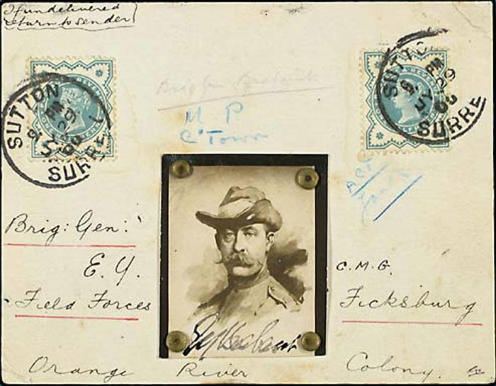 Sent by Bray to Brig. Gen., E.Y. (Cigarette card featuring General Brabant) CMG, Field Forces, Ficksburg, Orange River Colony on 29th July 1900 requesting his autograph.