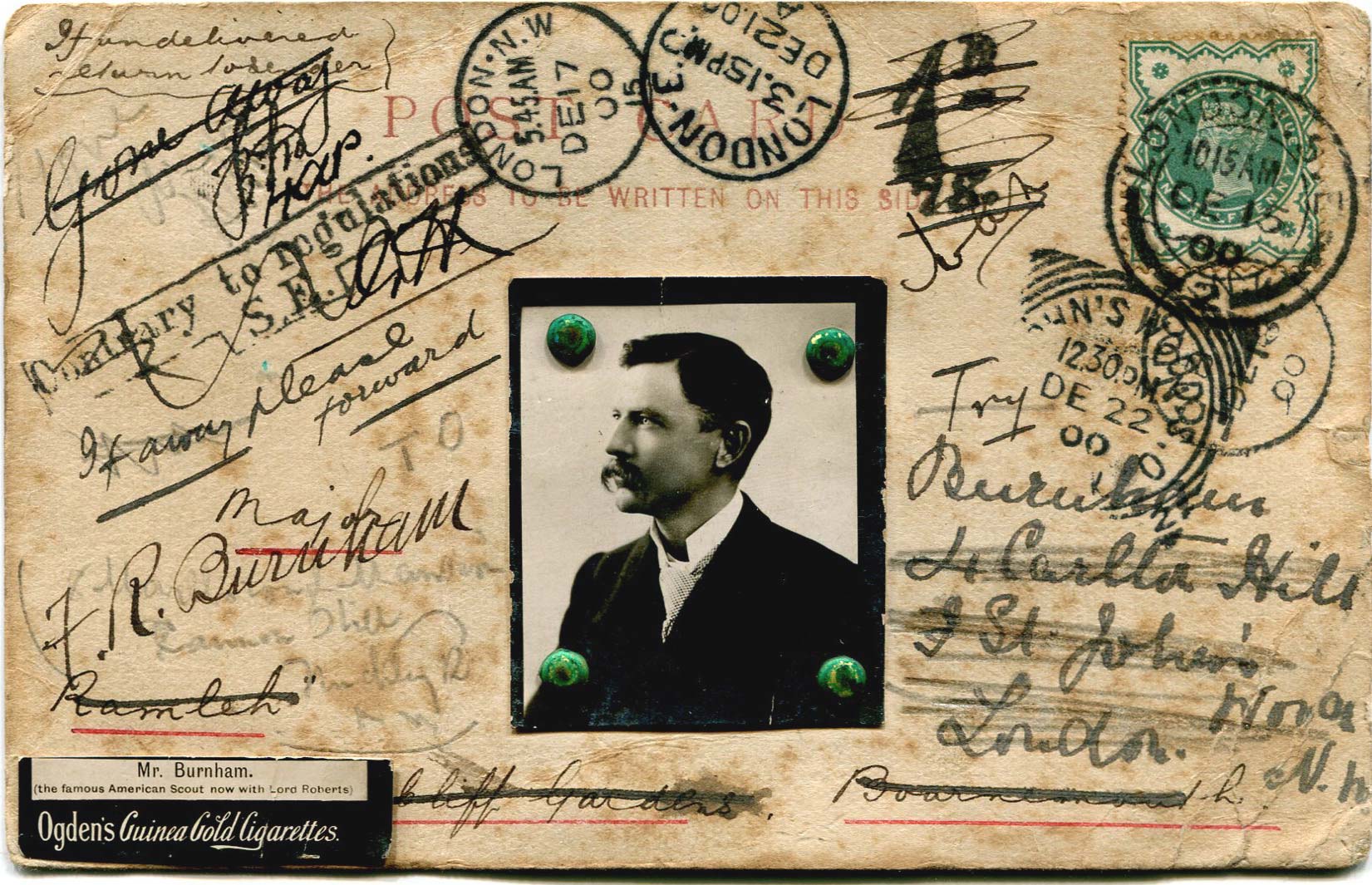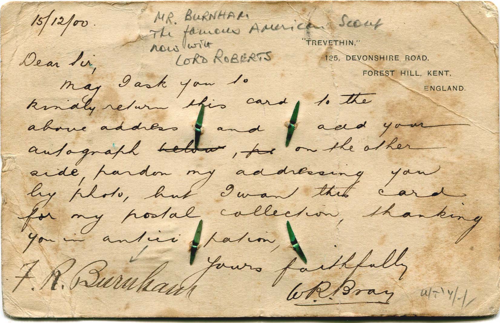 Sent by Bray to Major + (Cigarette card featuring Frederick Burnham) + West Cliff Gardens, Bournemouth on 15th December 1900 requesting his autograph.