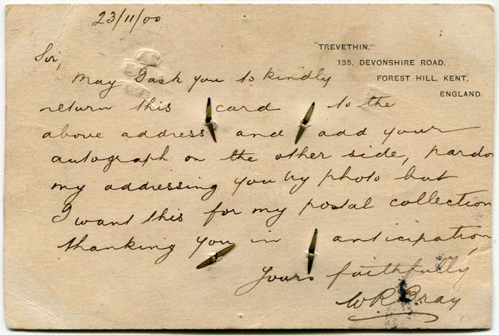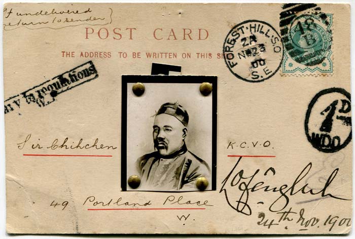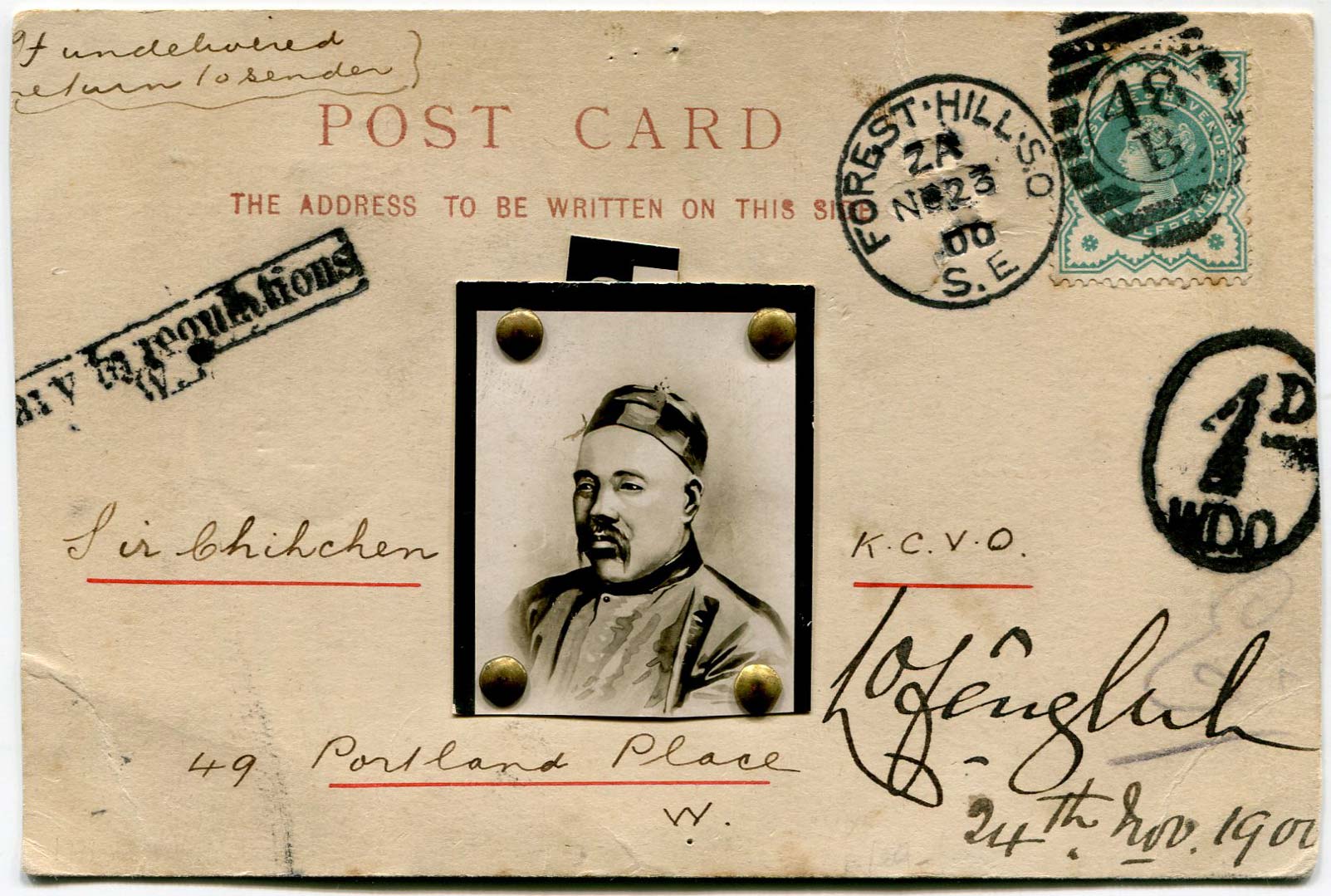 Sent by Bray to Sir Chihchen + (Cigarette card featuring Sir Chihchen Lo-Feng-Luh) + K.V.C.O., 49 Portland Place, W on 23rd November 1900 requesting his autograph.
