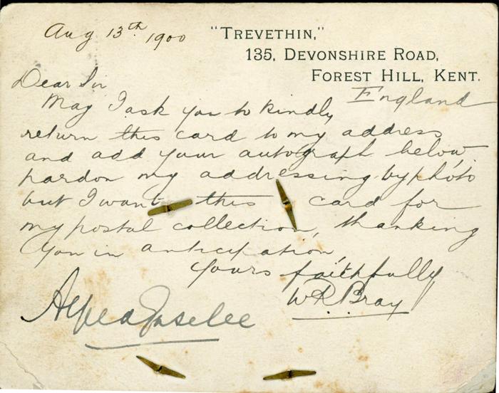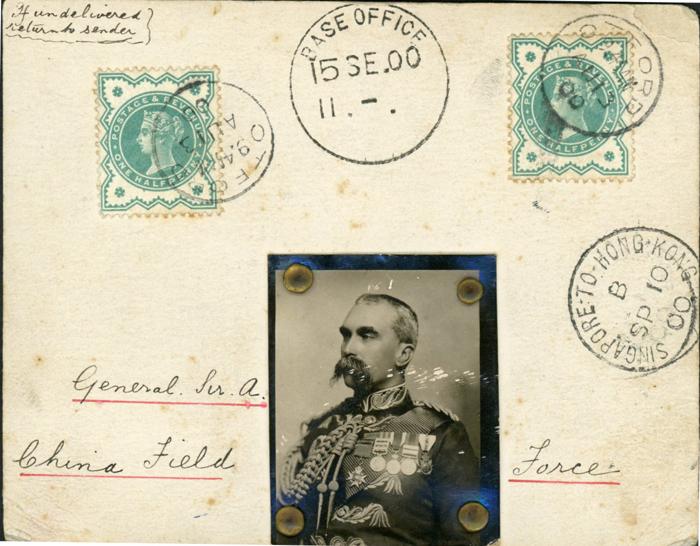 Sent by Bray to General Sir A. + (Cigarette card featuring Macdonald) + China Field Force on 13th August 1900 requesting his autograph.