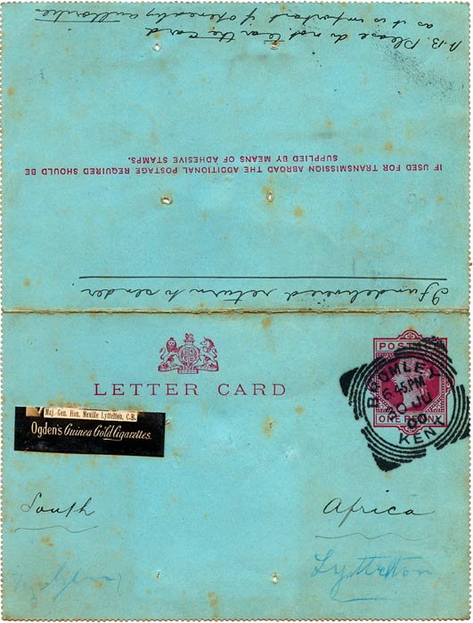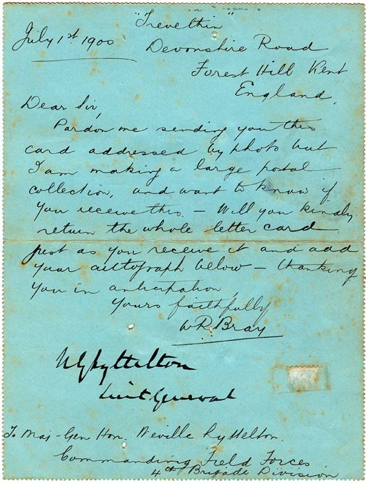 Sent by Bray to (Cigarette card featuring Major-General Neville Lyttelton) + South Africa on 1st July 1900 requesting his autograph.