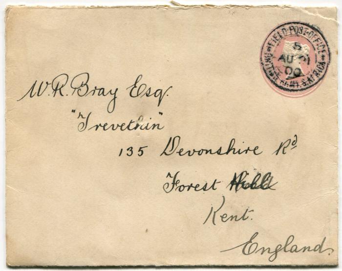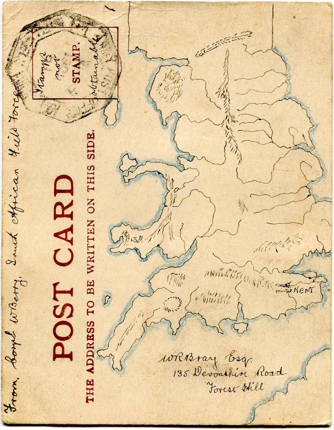 The address side of the postcard features a hand drawn map of England and Wales that formed part of the address on a picture postcard sent to Bray from a soldier serving in South Africa during the Second Boer War. Although the postmark is indistinct, the year (1900) can be made out and the Christmas greeting implies that it was probably posted in December.