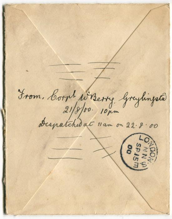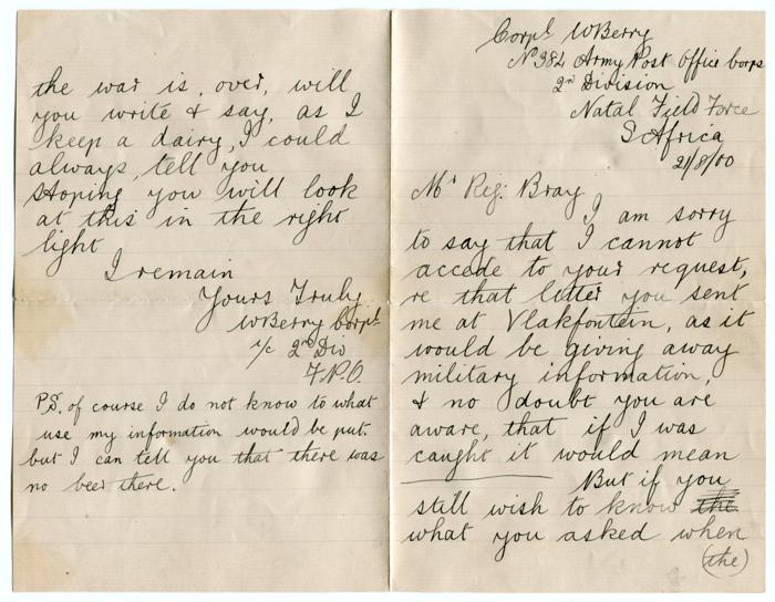 Also shown is a letter from the same Corporal Berry sent to Bray in response to an earlier enquiry made by Bray. The personal nature of the message on the postcard indicates that they may well have known each other prior to Berry's posting to the war zone. Possibly Berry was a postman from Forest Hill who was familiar with Bray's postal antics.