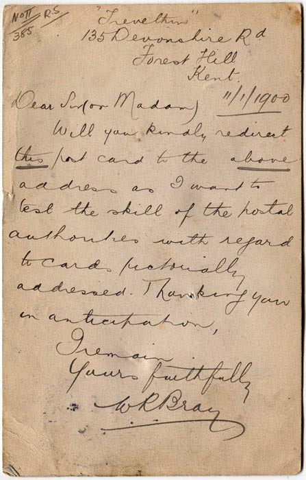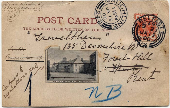 Postcard sent by Bray to The Proprietor of + photo of Poosie Nansies Inn, nr Mauchline Station on 11th January 1900.