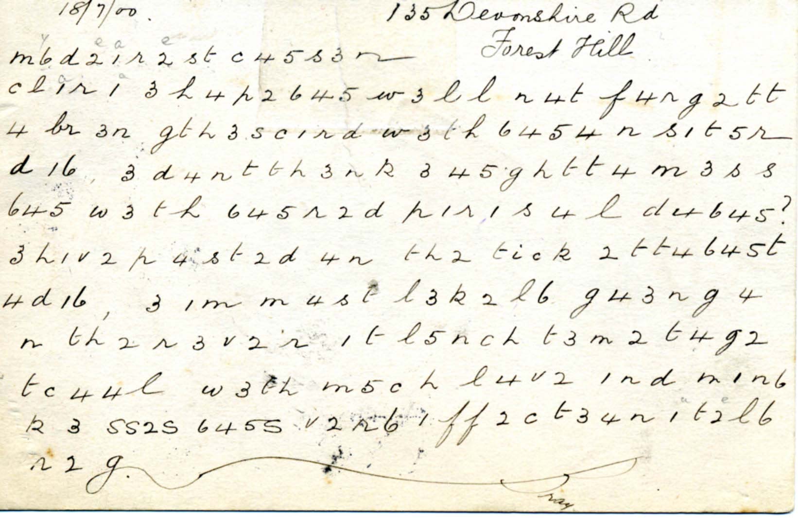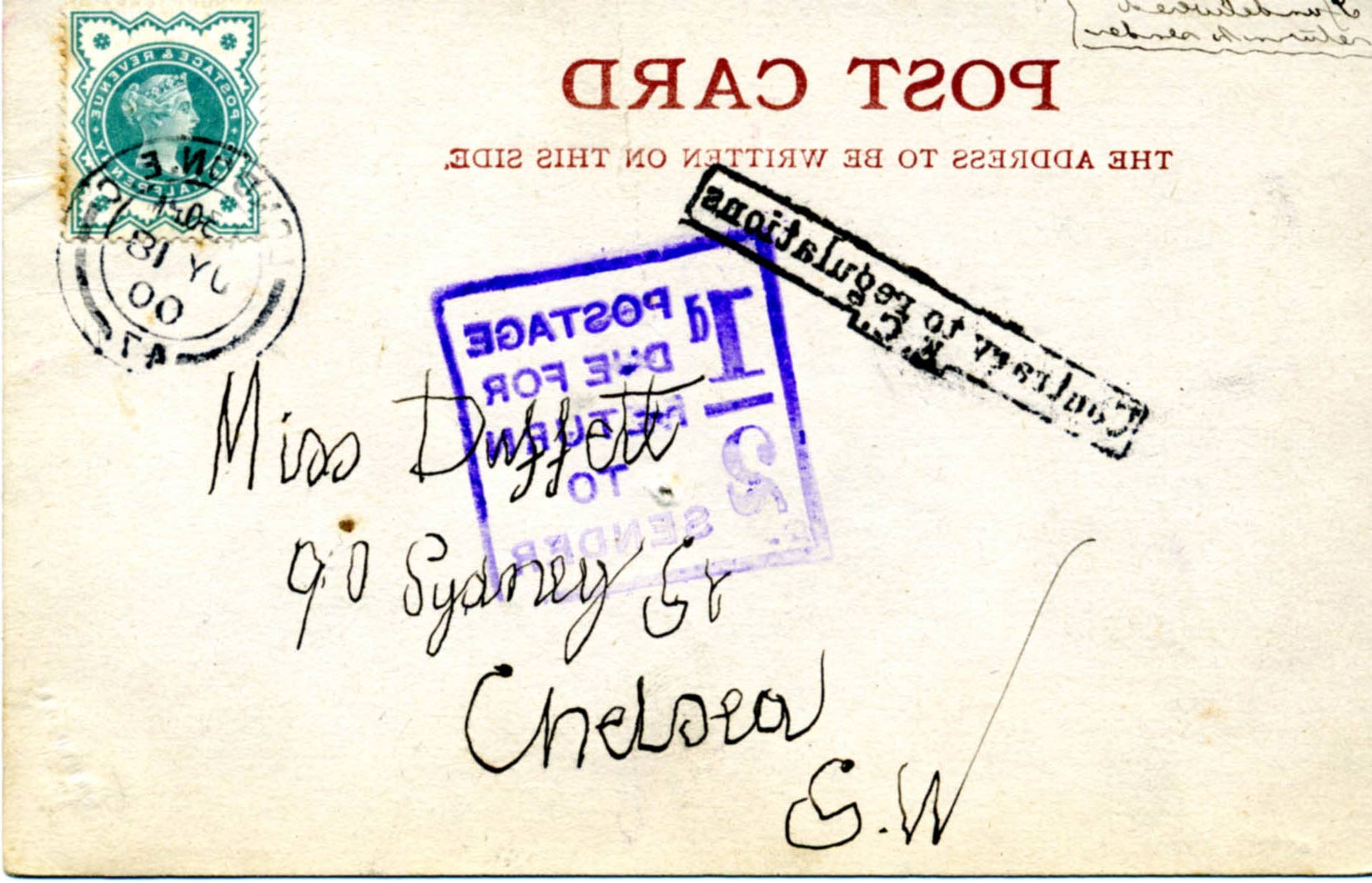 Sent by Bray to Miss Duffett 184, 90 Sydney Street, Chelsea, S.W. on 18th July 1900.