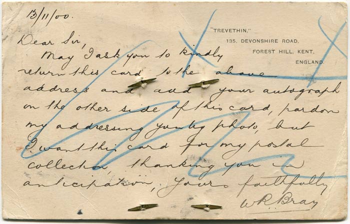 Sent by Bray to Colonel A.J. + (Cigarette card featuring Colonel Watson) + Field Forces, South Africa on 13th November 1900 requesting his autograph.