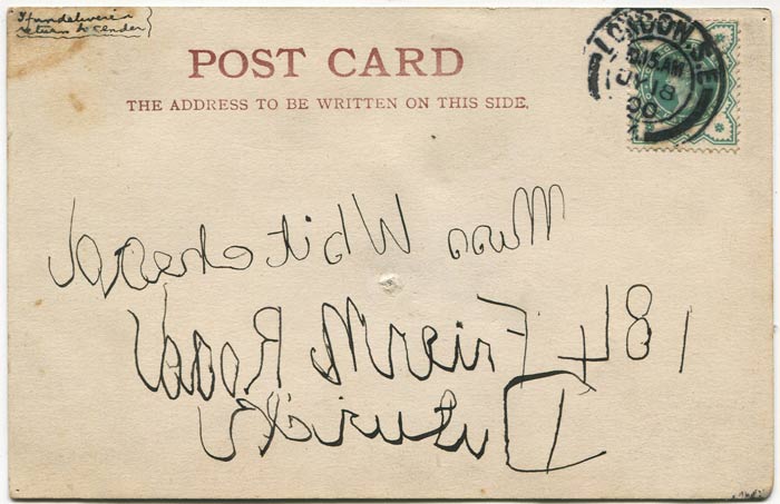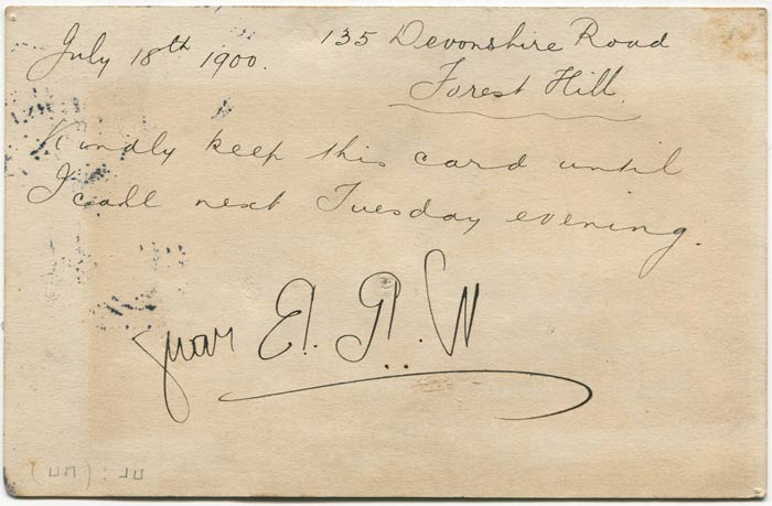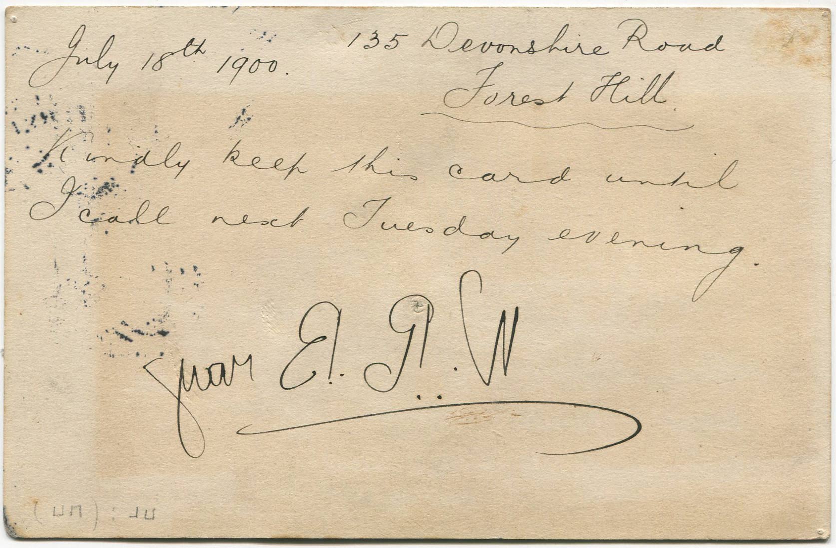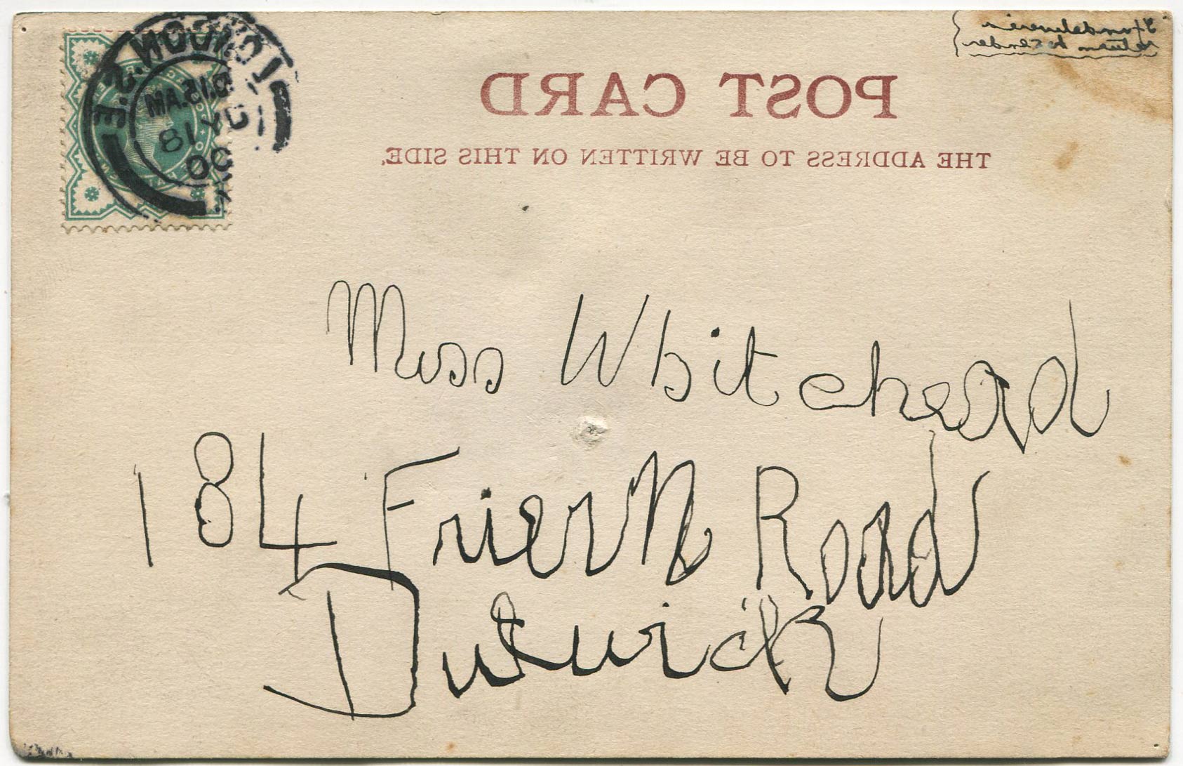 Sent by Bray to Miss Whitehead, 184, Fiern Road, Dulwich on 18th July 1900.