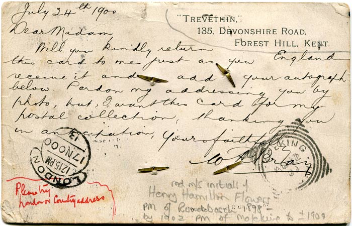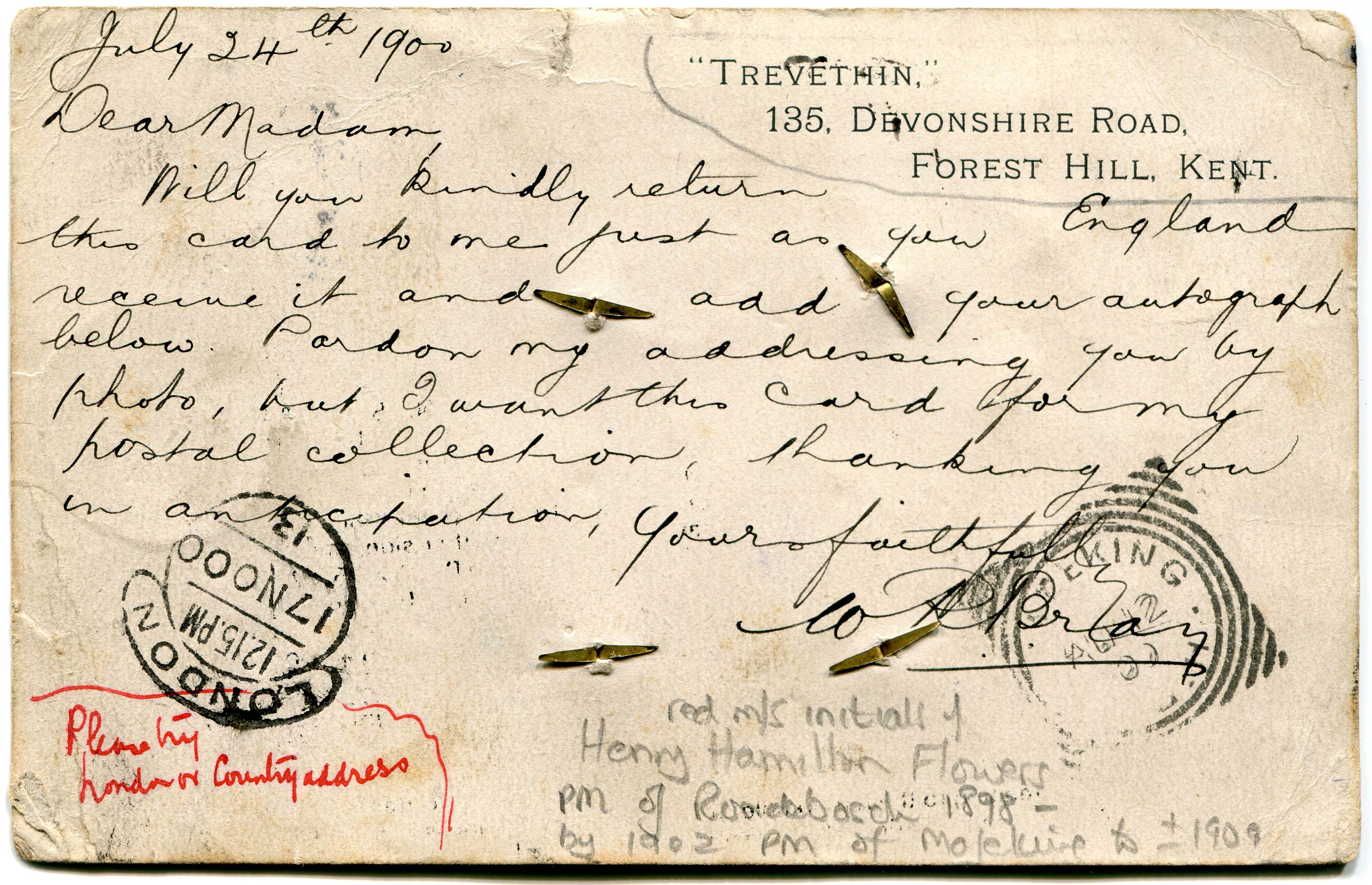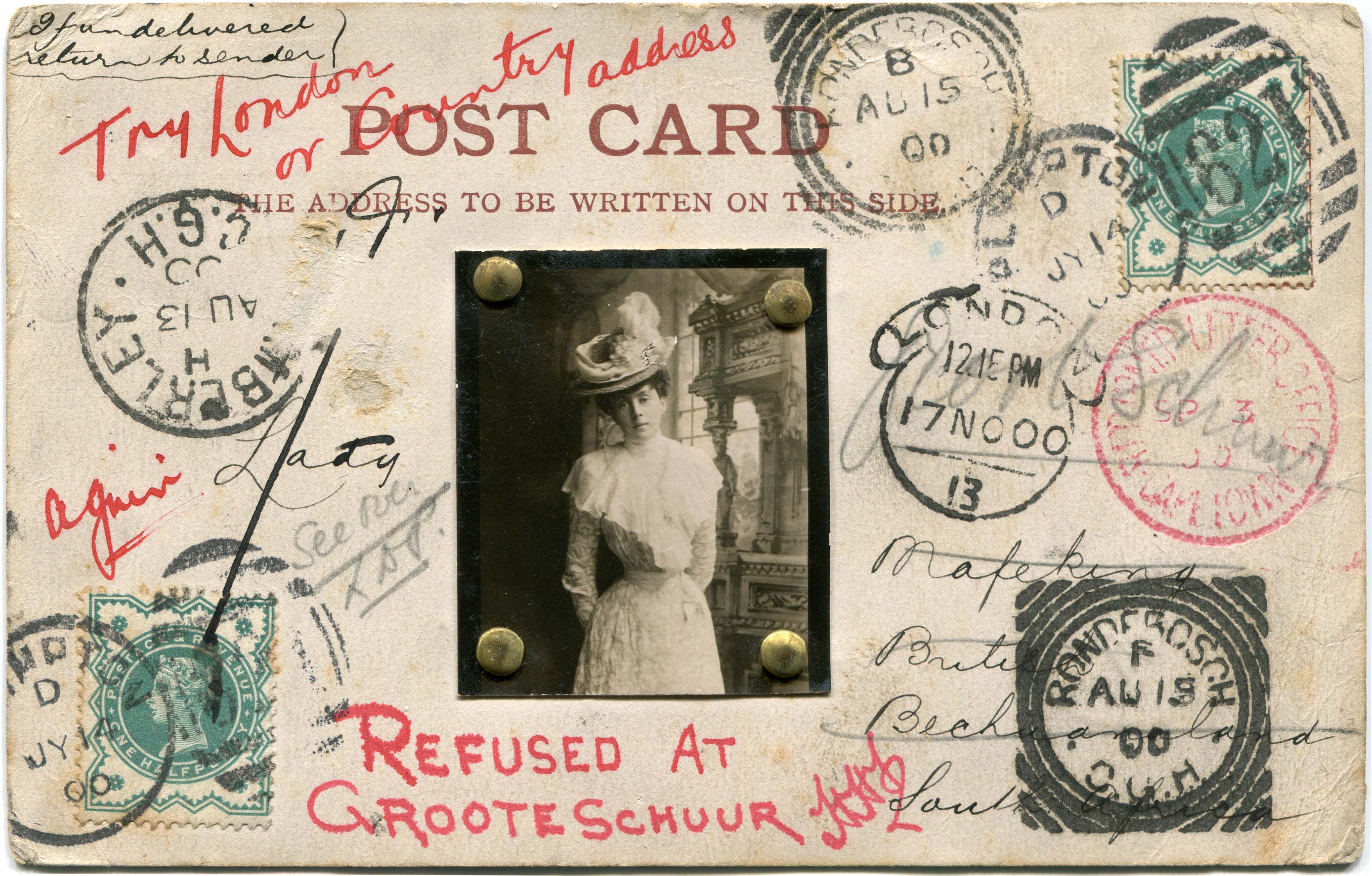 Sent by Bray to Lady + (Cigarette card featuring Lady Sara Wilson) + Mafeking, British Bechuanaland, South Africaon 24th July 1900 requesting her autograph.