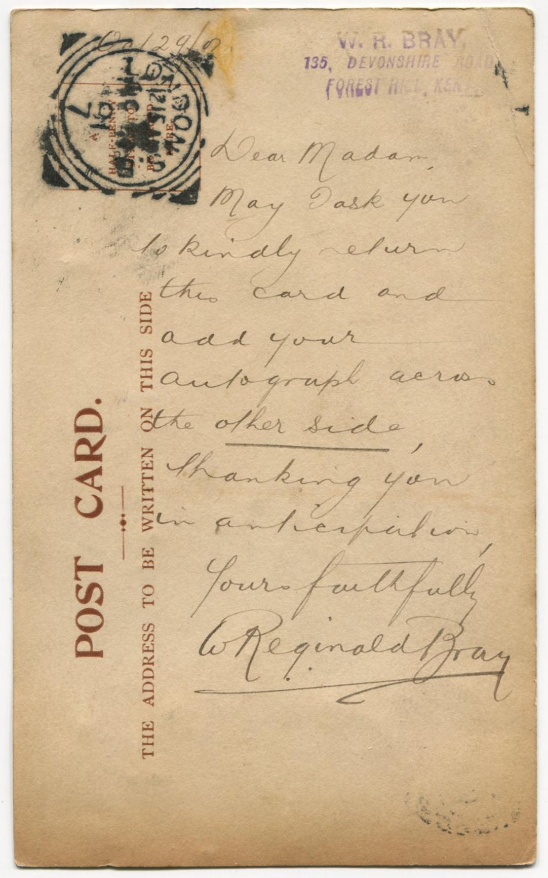 Picture postcard sent by Bray to Florence Collingbourne on 29th October 1901 requesting her autograph.