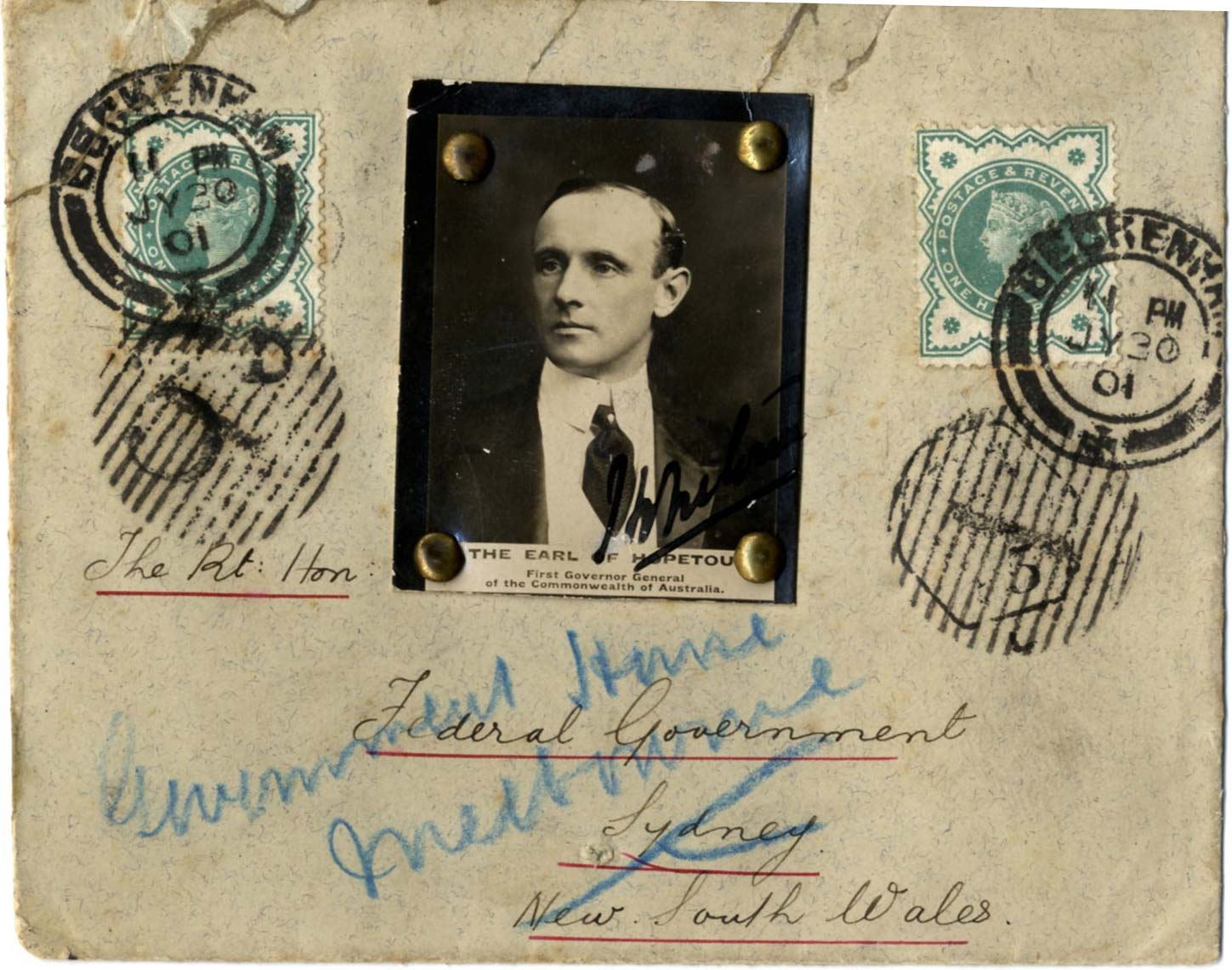Envelope sent by Bray to (Cigarette card featuring The Earl of Hopetoun) on 30th July 1901 requesting his autograph.