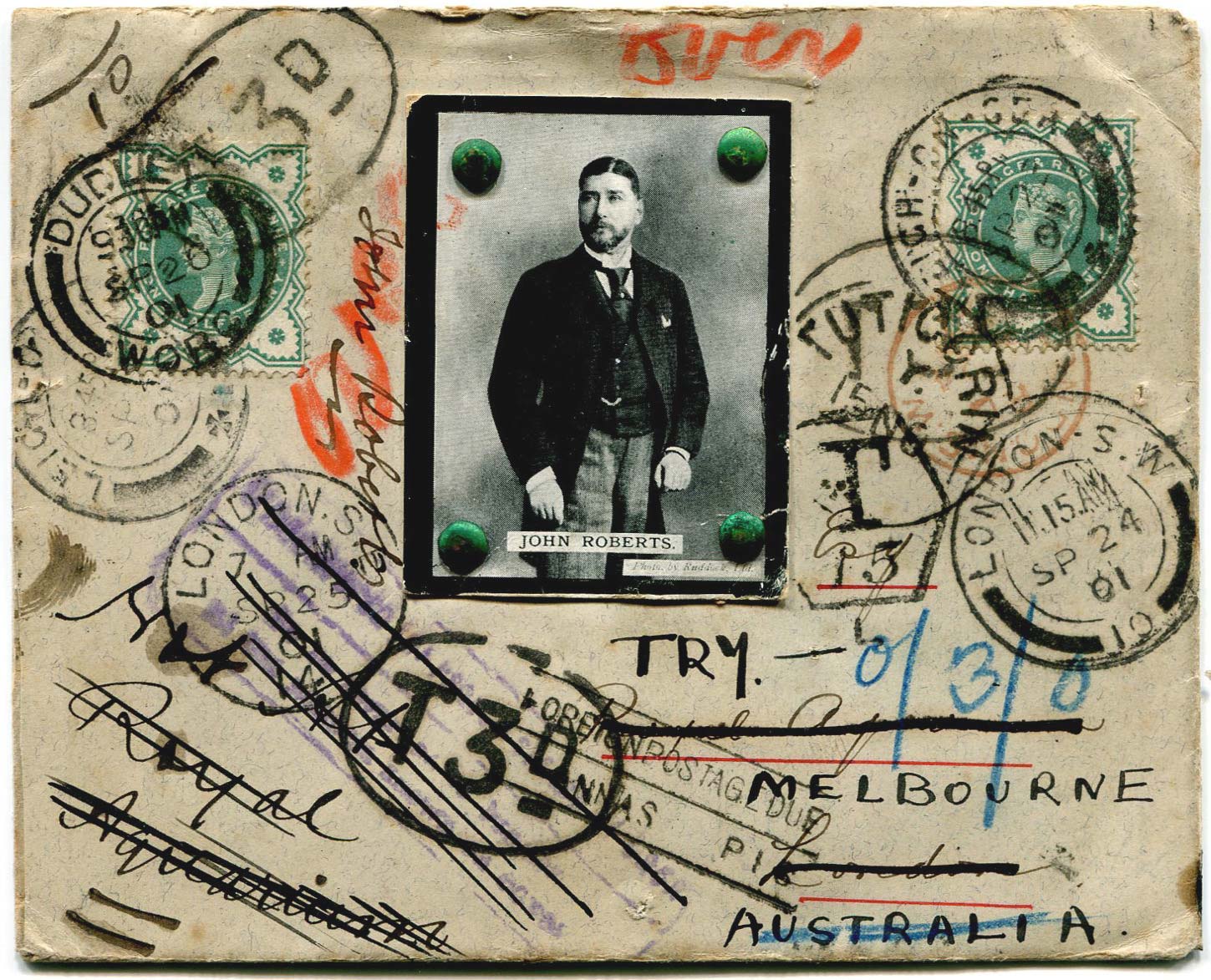 Envelope sent by Bray to (Cigarette card featuring John Roberts) on 23rd September 1901 requesting his autograph.