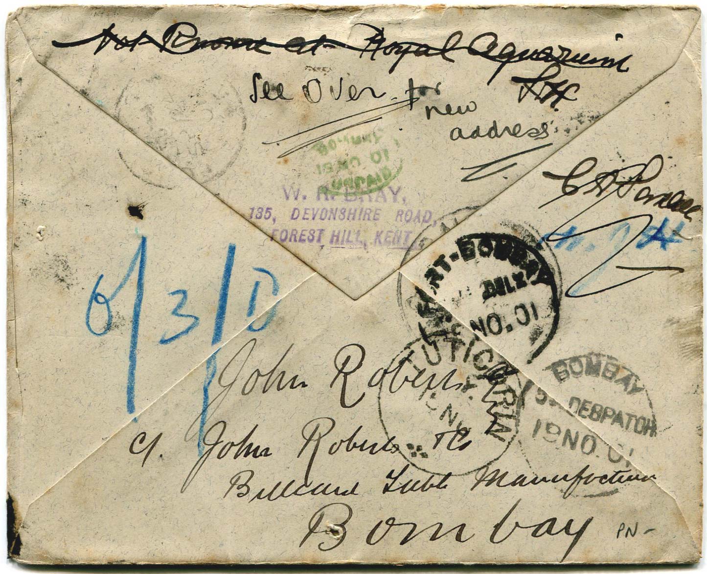 The request was redirected a number of times, including destinations in Australia and India, collecting a variety of postmarks and charge marks on the way. The envelope eventually made its way back to Bray complete with Robert's autograph.