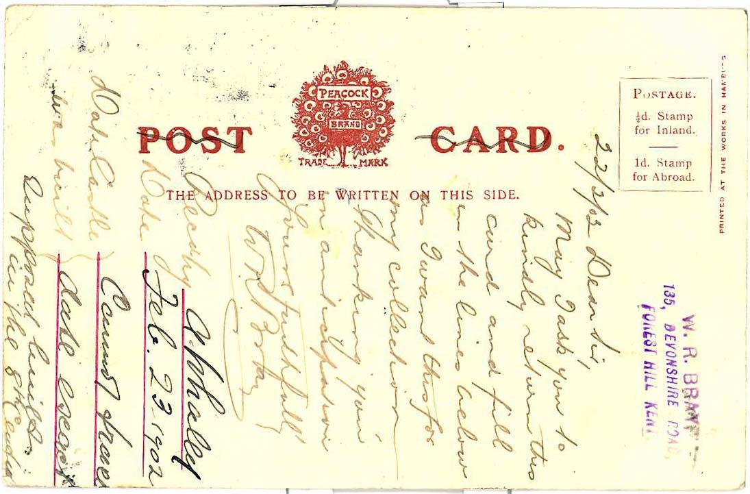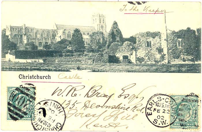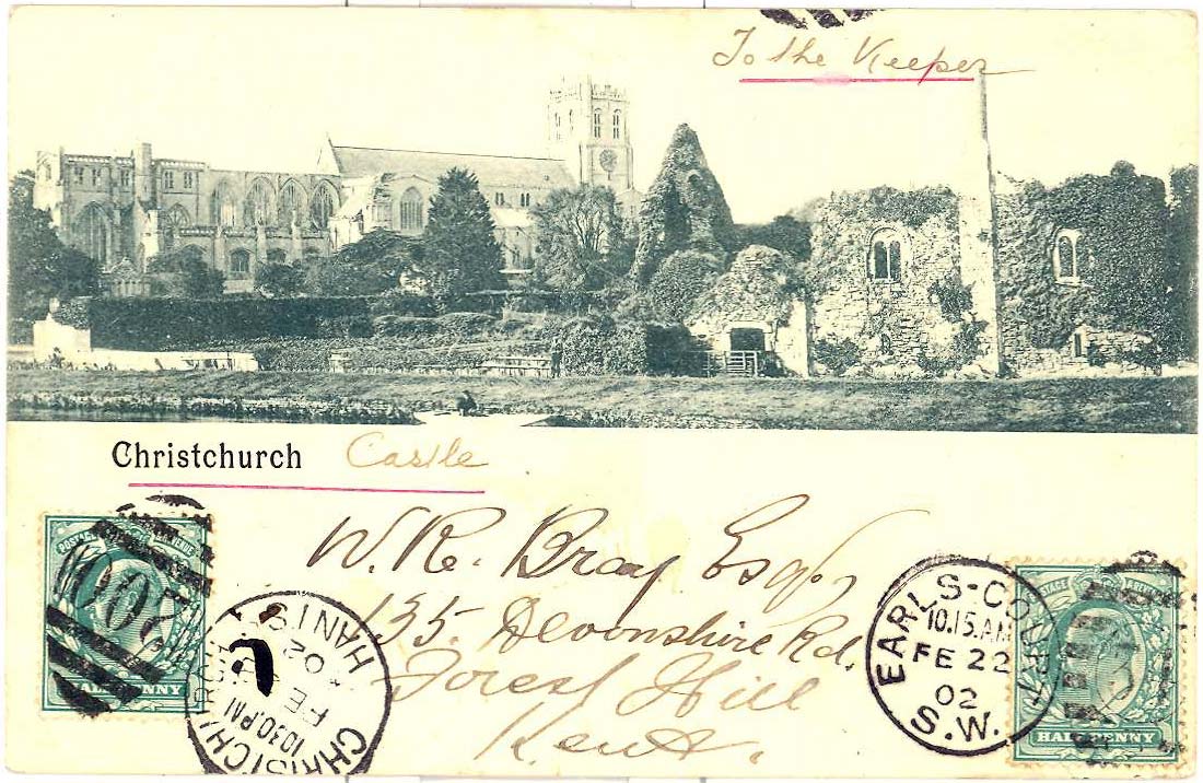 Picture postcard sent by Bray to The Keeper (picture of Christchurch) + castle on 22nd February 1902 requesting his autograph.