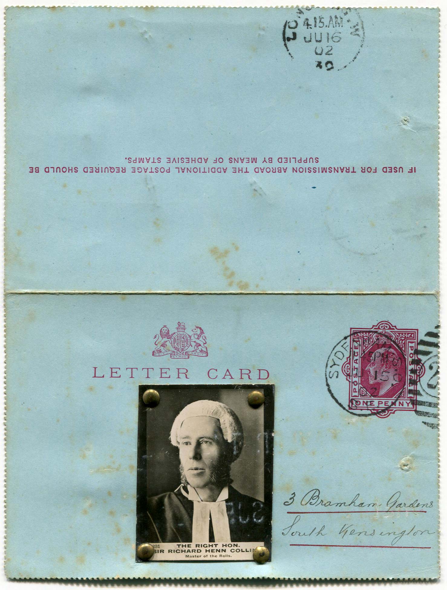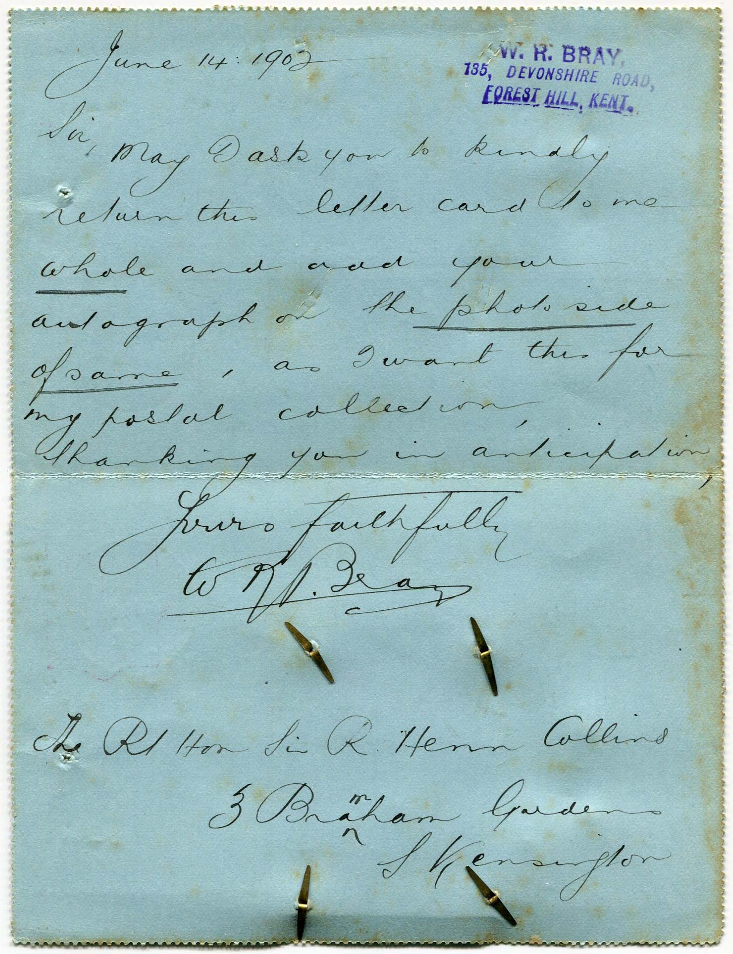 Lettercard sent by Bray to (Cigarette card featuring The Right Hon. Sir Richard Henn Collins) on 14th June 1902 requesting his autograph.