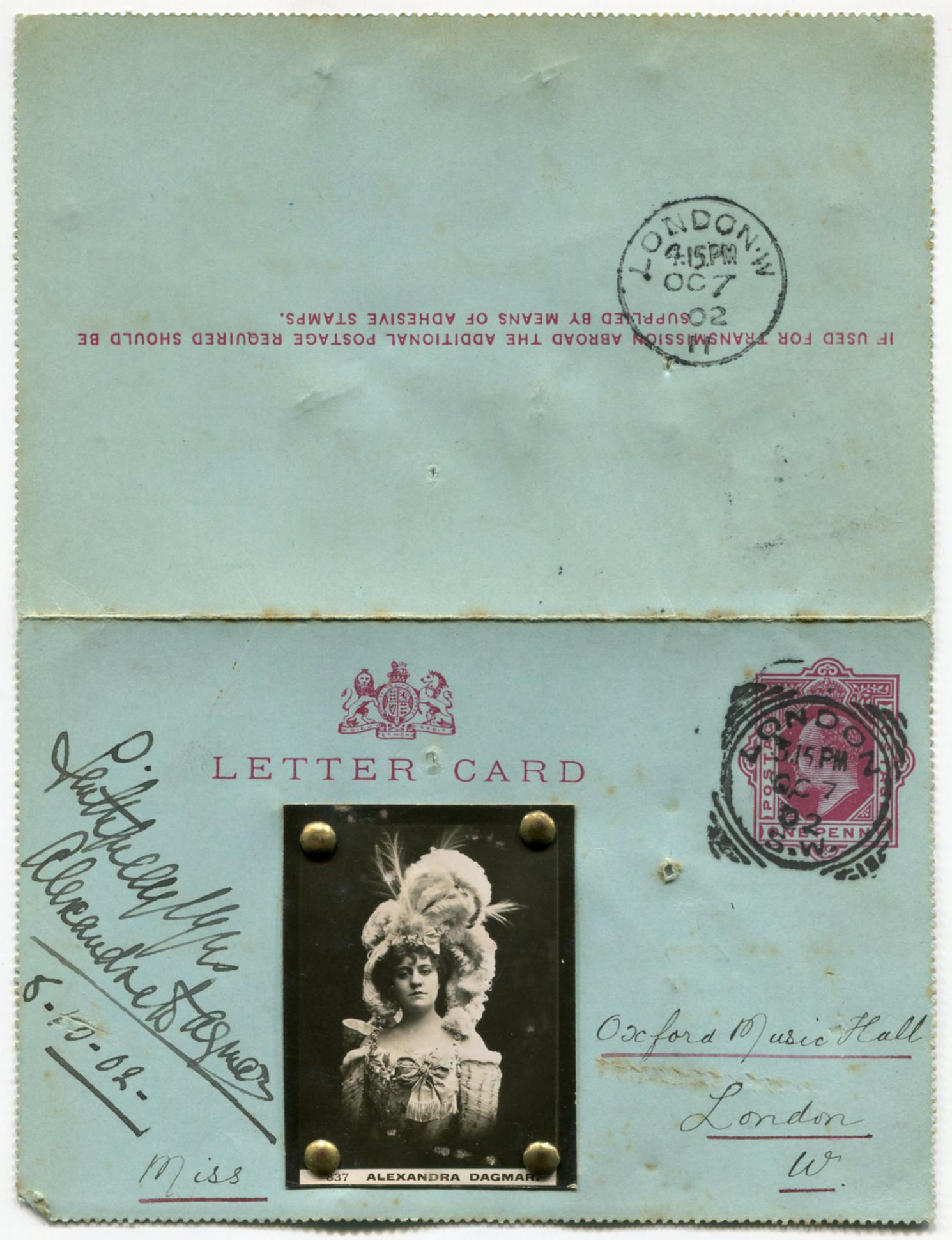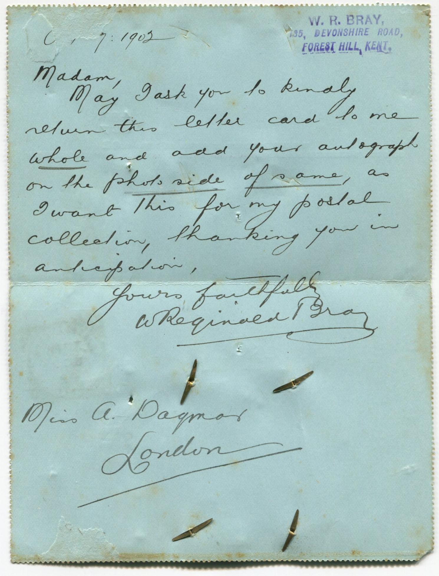 Lettercard sent by Bray to (Cigarette card featuring Alexandra Dagmar) on 7th October 1902 requesting her autograph.