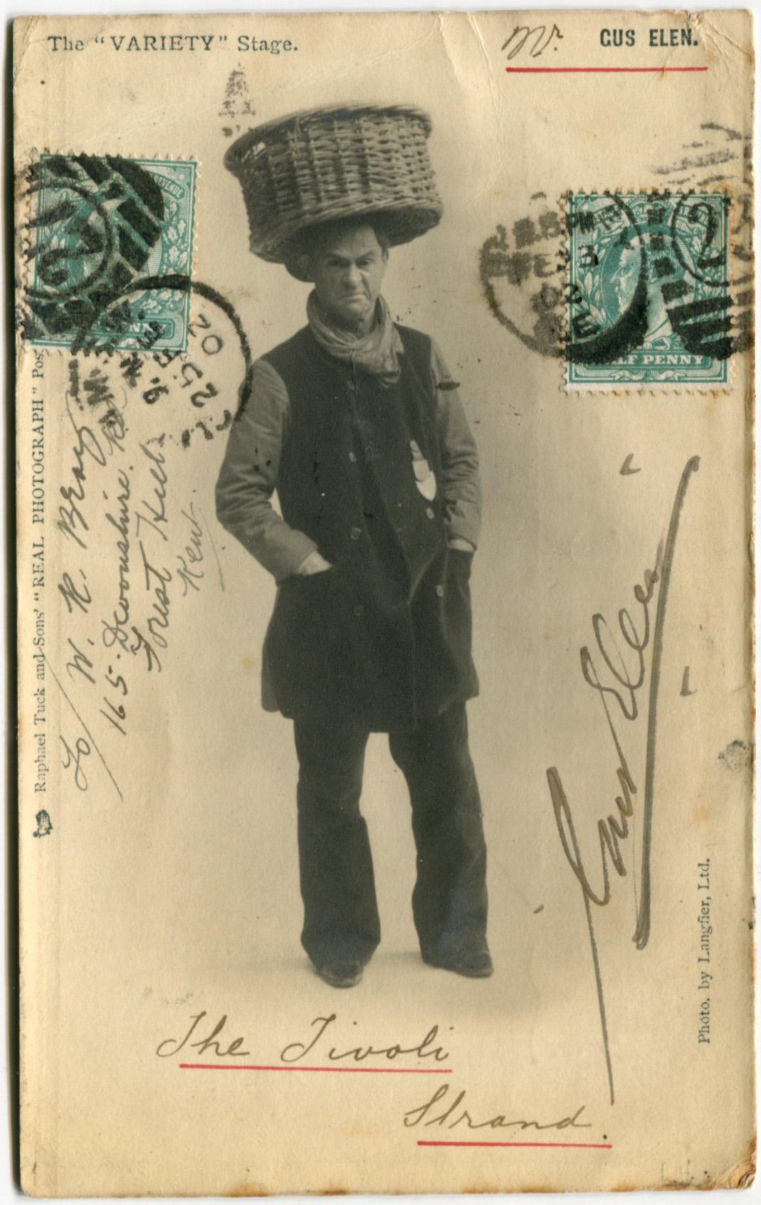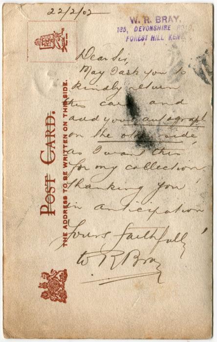 Picture postcard sent by Bray to Gus Elen on 22nd February 1902 asking for his autograph.