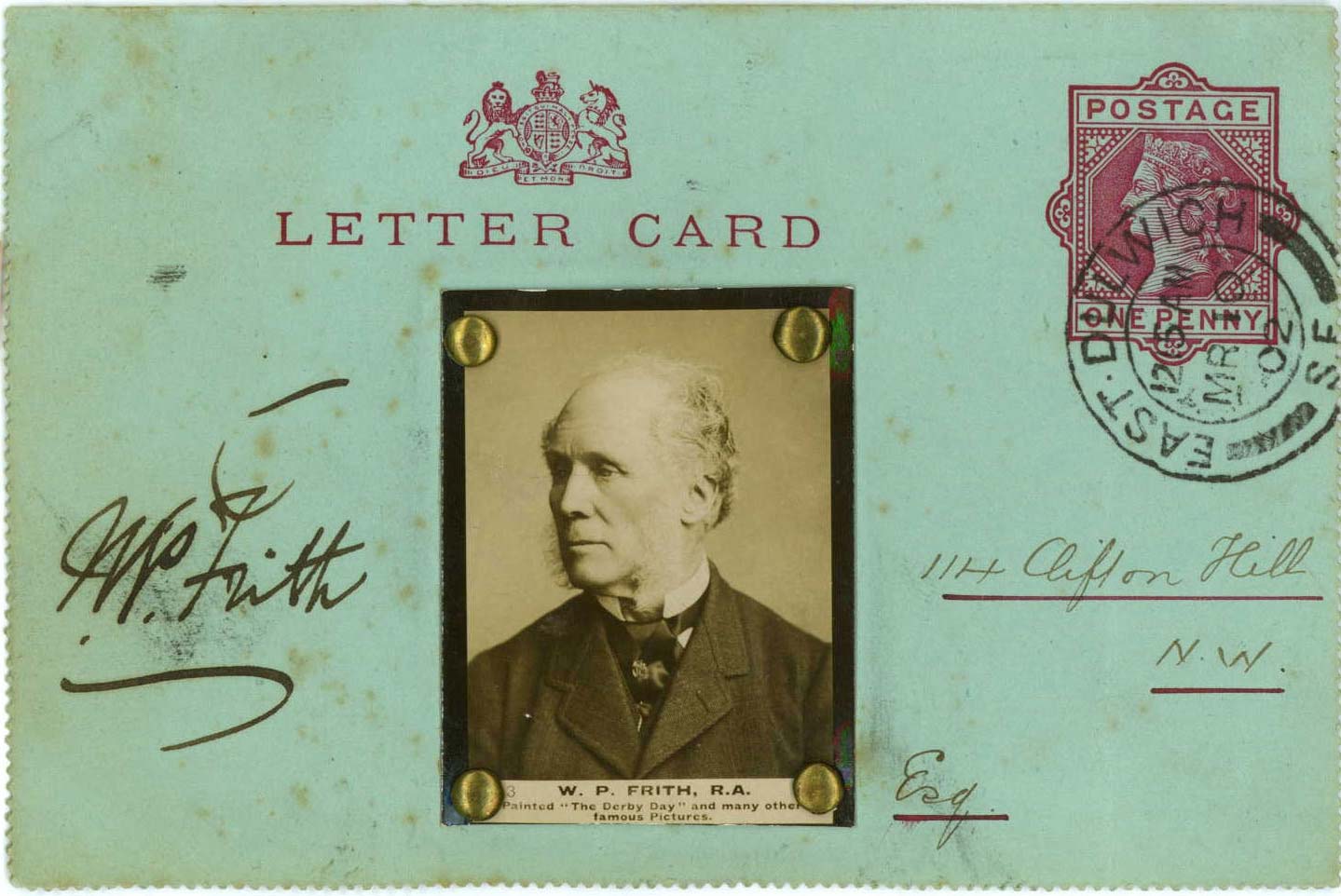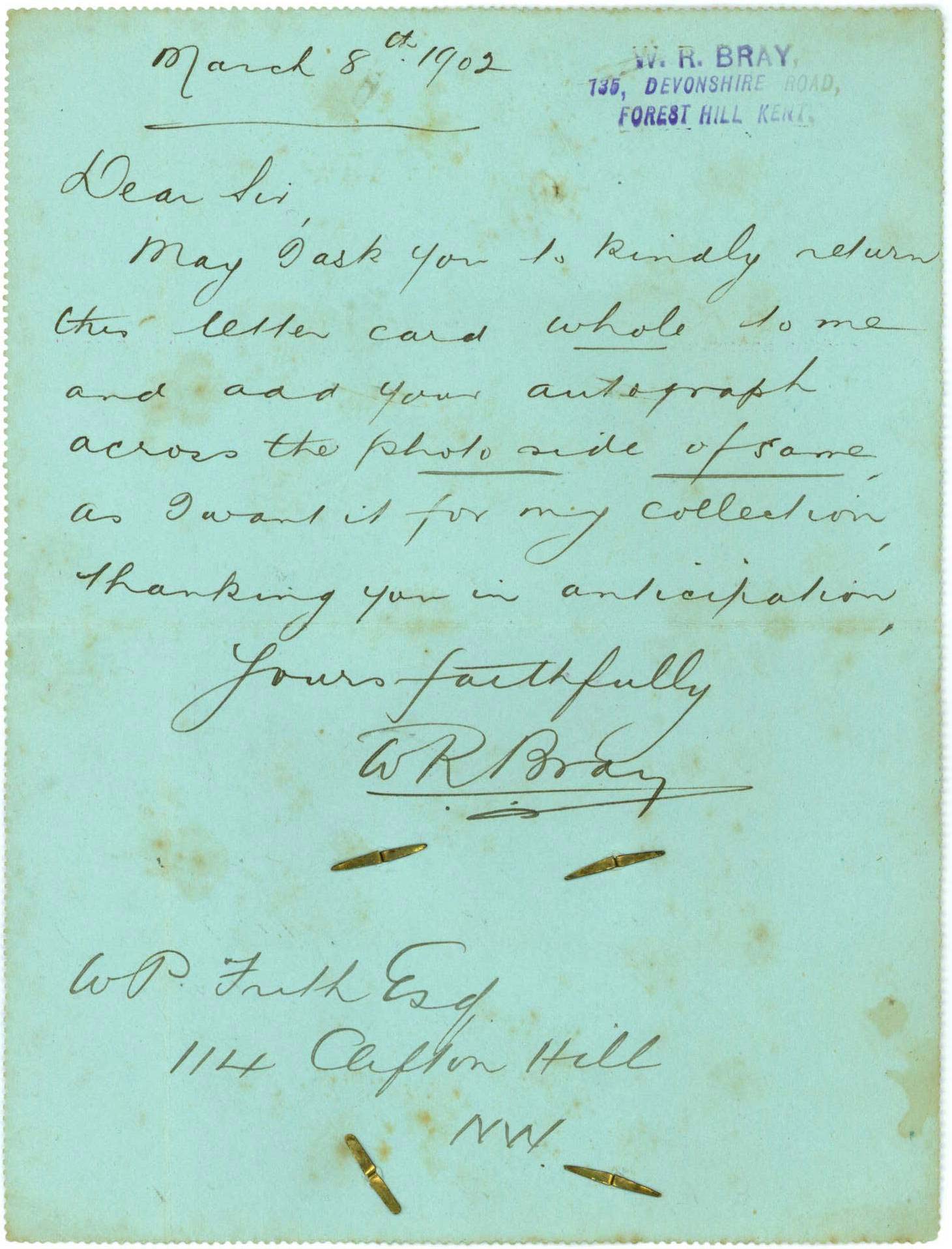 Lettercard sent by Bray to (Cigarette card featuring W.P. Frith) on 8th March 1902 requesting his autograph.