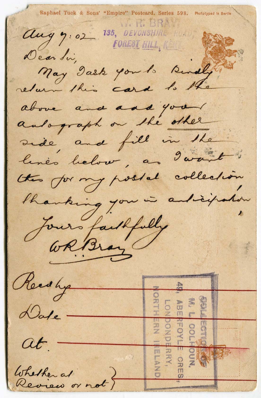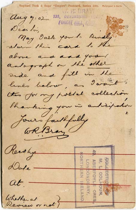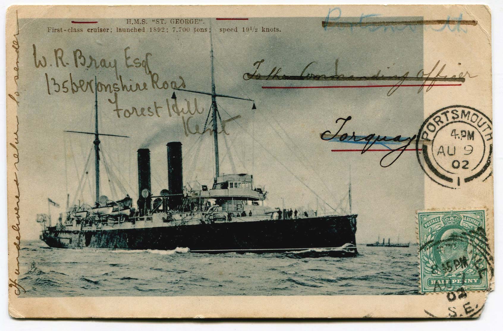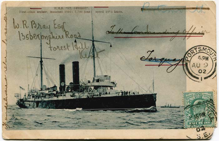 Picture postcard sent by Bray to The Commanding Office of + (postcard featuring HMS St.George) on 7th August 1902 requesting his autograph.