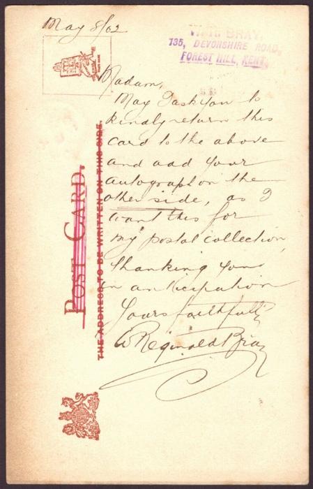 Picture postcard sent by Bray to Harriet Vernon on 8th May 1902 asking for her autograph.