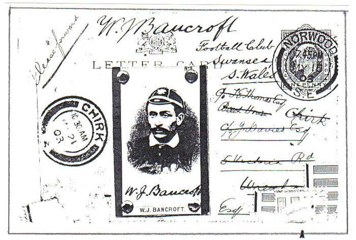 Lettercard sent by Bray to (Cigarette card featuring W.J. Bancroft) + c/o J. Davies, 5 Victoria Rd, Wrexham on 16th May 1903 requesting his autograph.