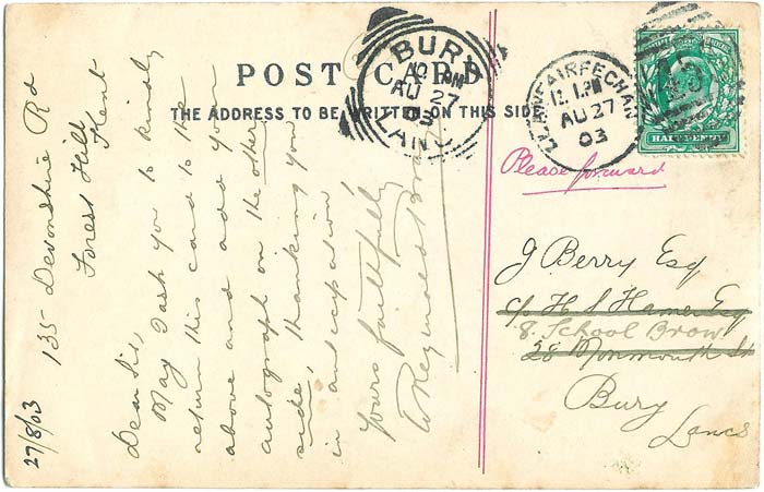 Picture postcard sent by Bray to J.R. Berry on 27th August 1903 requesting his autograph.
